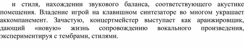 Важная роль в работе с юным вокалистом отводится концертмейстеру, играющему на электронном инструменте. Между ними должна возникнуть творческая связь, сотрудничество для раскрытия художественного образа каждого музыкального материала. Разнообразие репертуара обязывает концертмейстера владеть различными приемами игры, развитым чувством ритма и стиля, нахождении звукового баланса, соответствующего акустике помещения. Владение игрой на клавишном синтезаторе во многом украшает аккомпанемент. Зачастую, концертмейстер выступает как аранжировщик, дающий «новую» жизнь сопровождению вокального произведения, экспериментируя с тембрами, стилями.