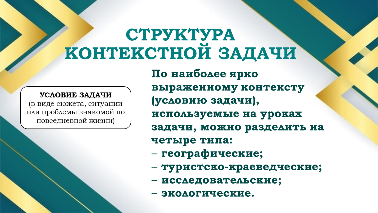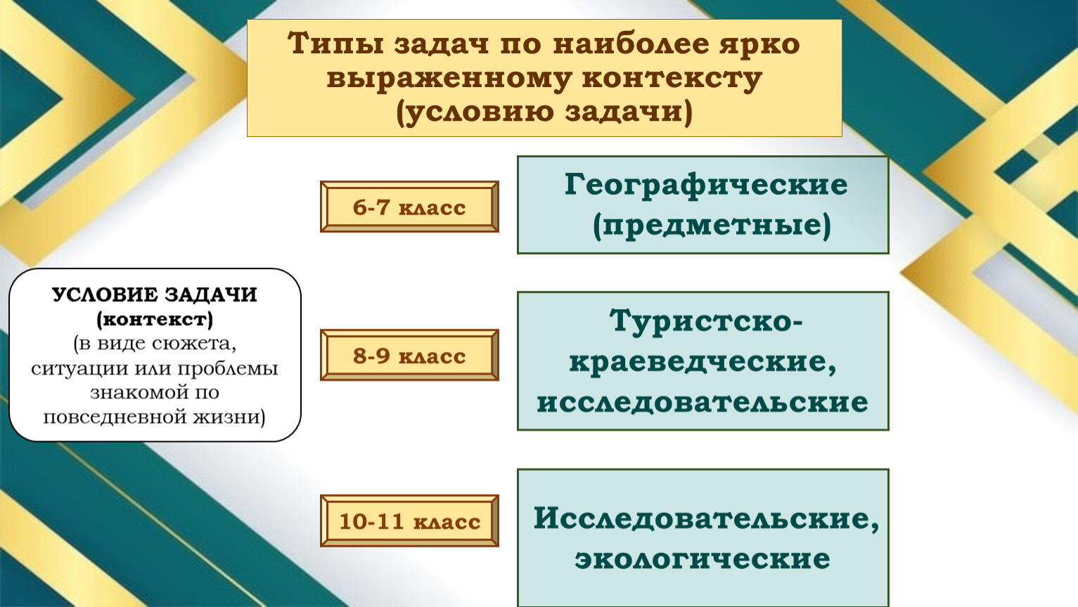 По наиболее ярко выраженному контексту (условию задачи), используемые на уроках задачи, можно разделить на четыре типа: