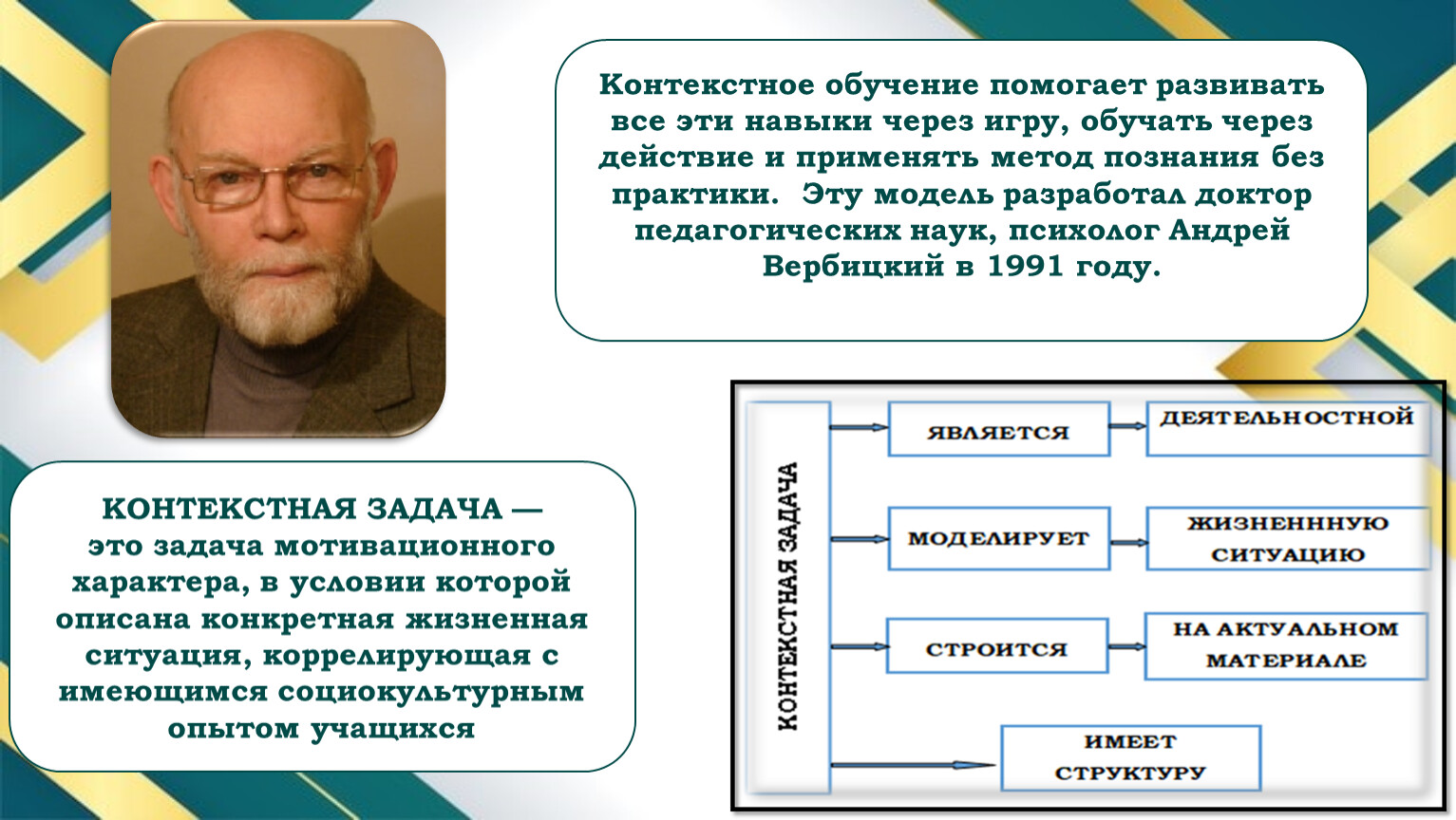 Контекстное обучение помогает развивать все эти навыки через игру, обучать через действие и применять метод познания без практики. Эту модель разработал доктор педагогических наук, психолог Андрей Вербицкий в 1991 году.