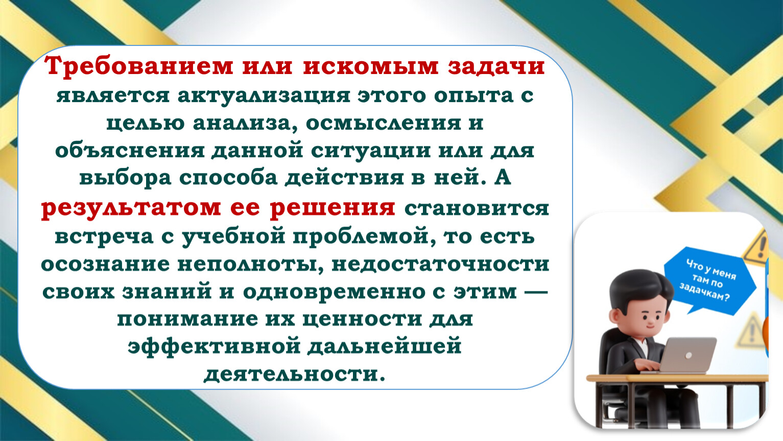 Требованием или искомым задачи является актуализация этого опыта с целью анализа, осмысления и объяснения данной ситуации или для выбора способа действия в ней. А результатом ее решения становится встреча с учебной проблемой, то есть осознание неполноты, недостаточности своих знаний и одновременно с этим — понимание их ценности для эффективной дальнейшей деятельности.