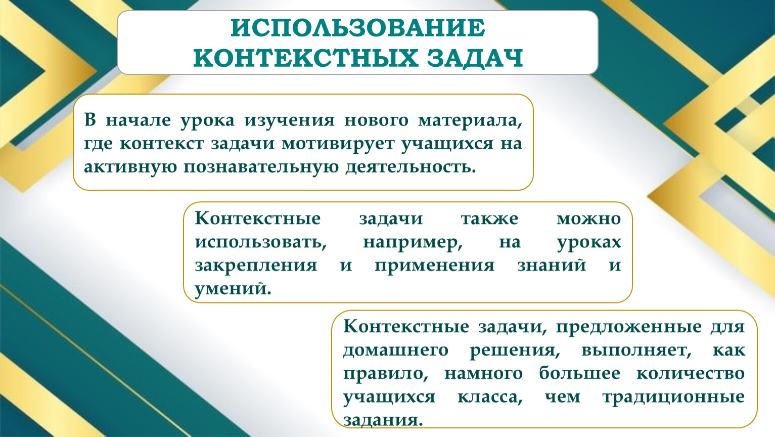Контекстные задачи также можно использовать, например, на уроках закрепления и применения знаний и умений.