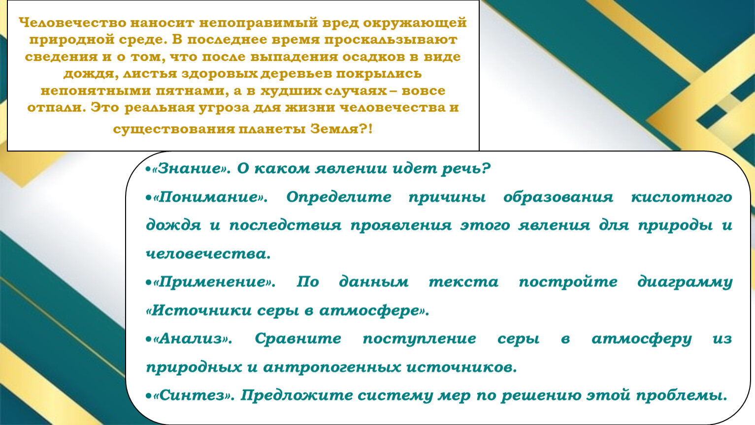«Понимание». Определите причины образования кислотного дождя и последствия проявления этого явления для природы и человечества.