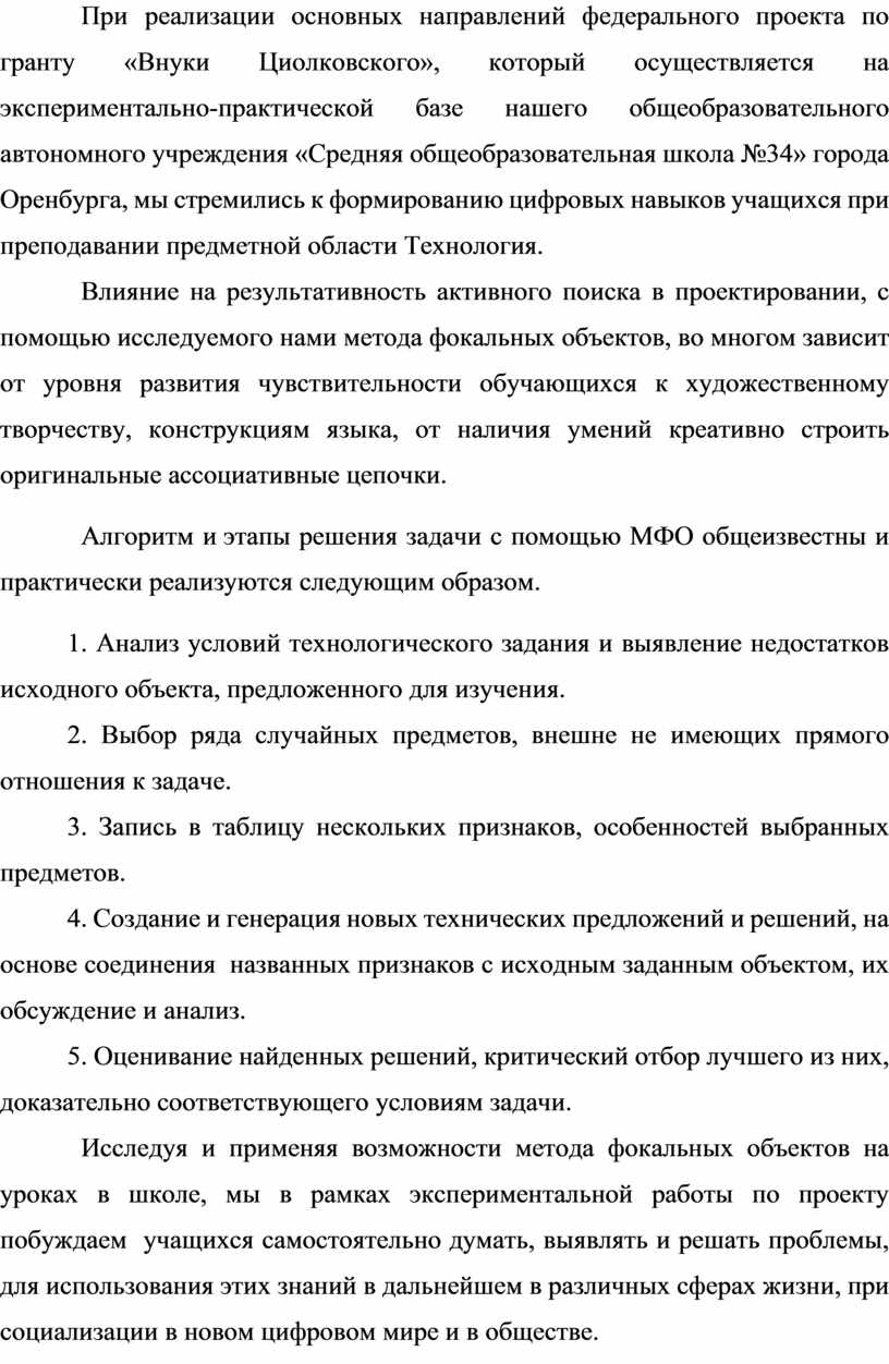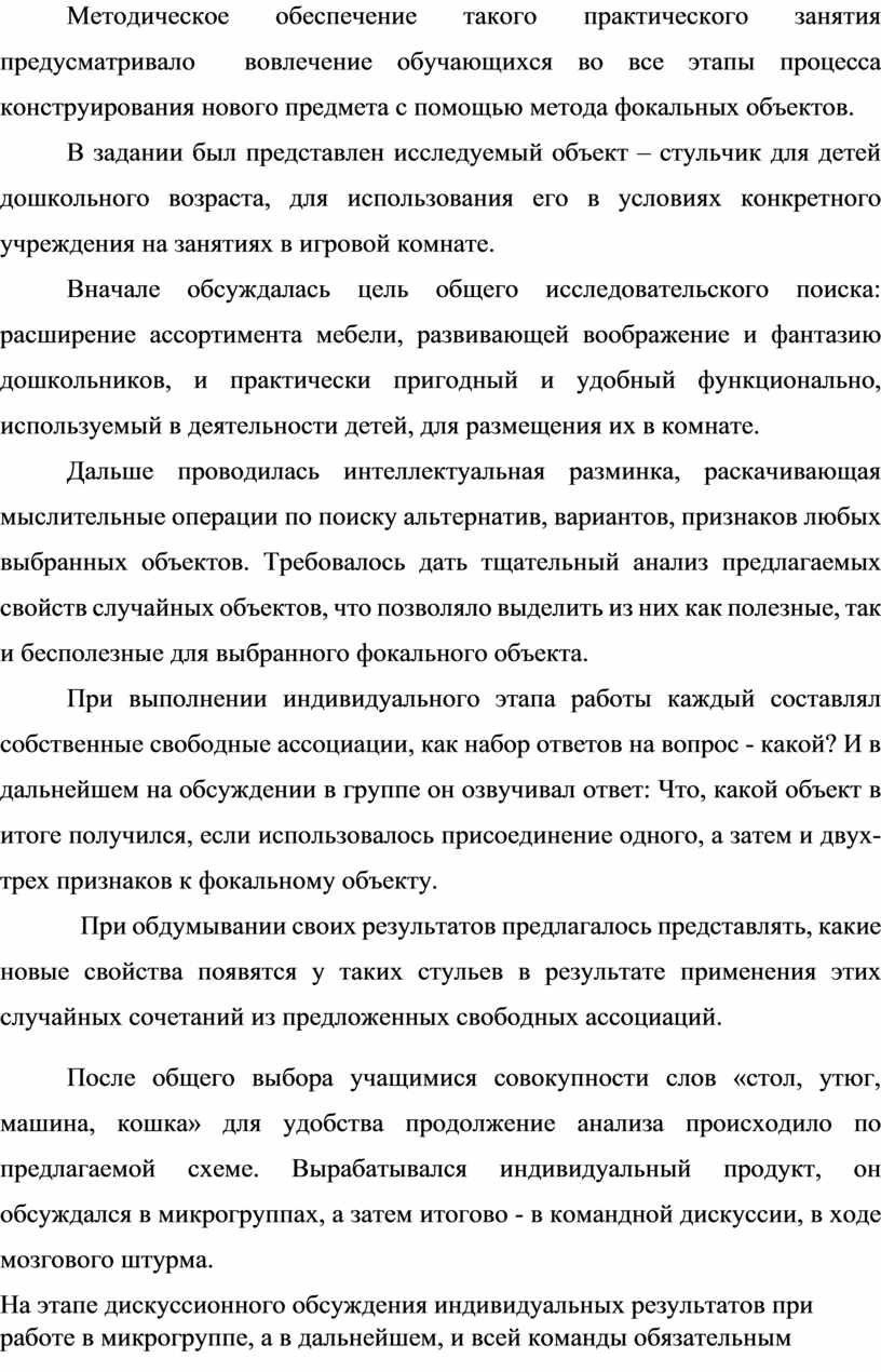 Методическое обеспечение такого практического занятия предусматривало вовлечение обучающихся во все этапы процесса конструирования нового предмета с помощью метода фокальных объектов.