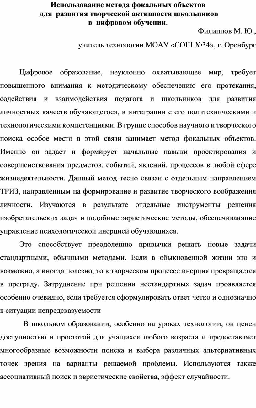 Цифровое образование, неуклонно охватывающее мир, требует повышенного внимания к методическому обеспечению его протекания, содействия и взаимодействия педагога и школьников для развития личностных качеств обучающегося, в интеграции с его политехническими и технологическими компетенциями. В группе способов научного и творческого поиска особое место в этой связи занимает метод фокальных объектов. Именно он задает и формирует начальные навыки проектирования и совершенствования предметов, событий, явлений, процессов в любой сфере жизнедеятельности. Данный метод тесно связан с отдельным направлением ТРИЗ, направленным на формирование и развитие творческого воображения личности. Изучаются в результате отдельные инструменты решения изобретательских задач и подобные эвристические методы, обеспечивающие управление психологической инерцией обучающихся.