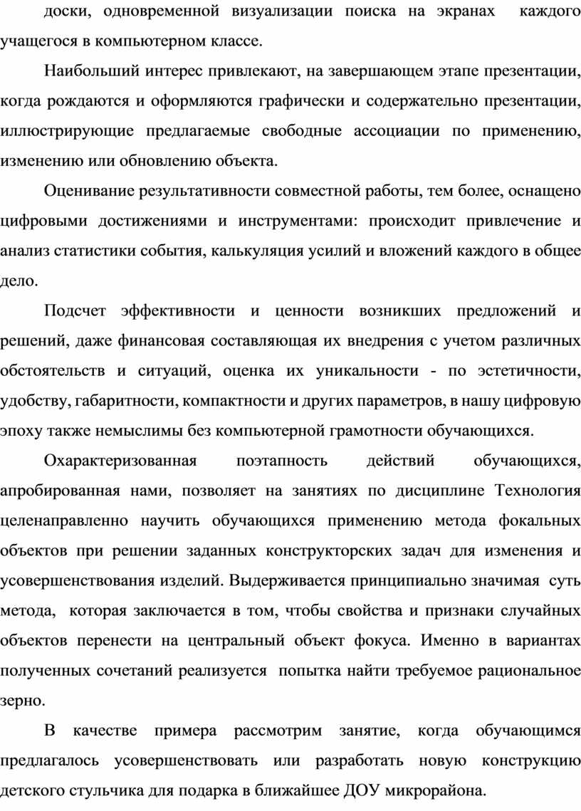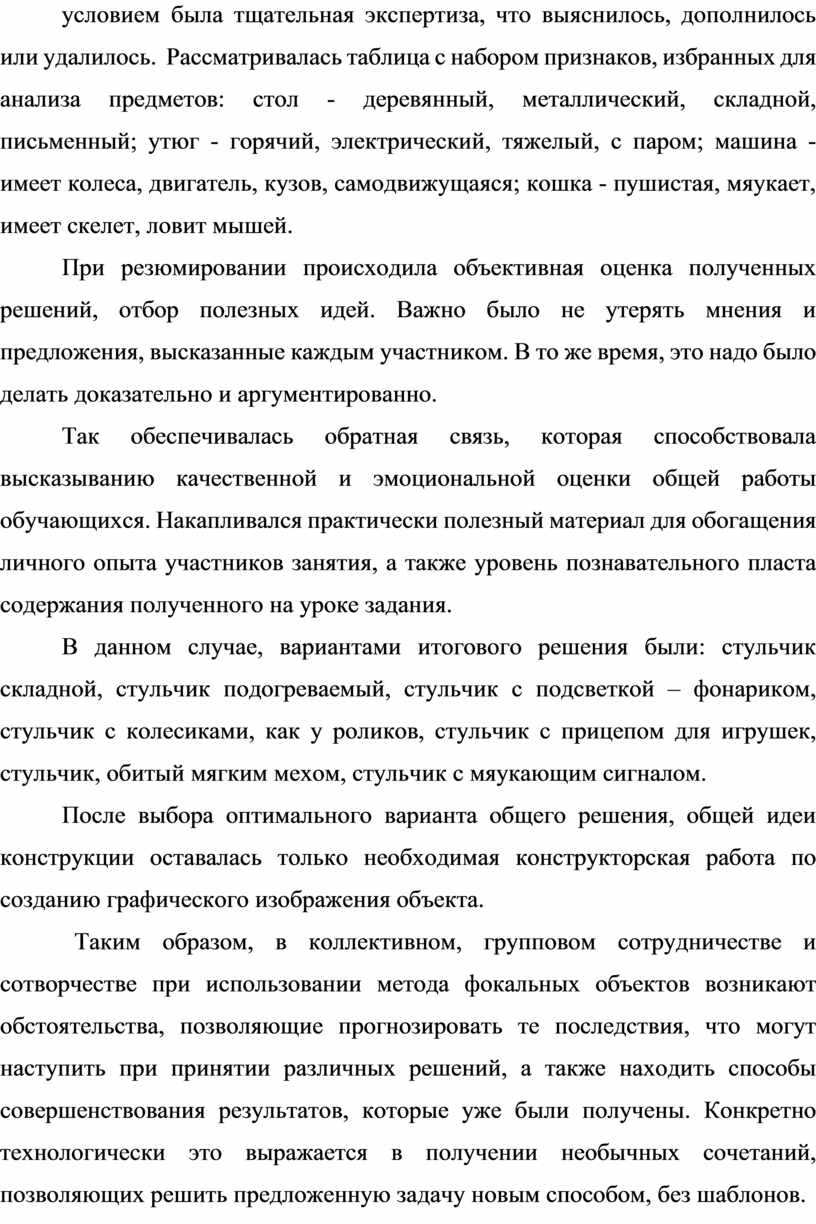 Охарактеризованная поэтапность действий обучающихся, апробированная нами, позволяет на занятиях по дисциплине Технология целенаправленно научить обучающихся применению метода фокальных объектов при решении заданных конструкторских задач для изменения и усовершенствования изделий. Выдерживается принципиально значимая суть метода, которая заключается в том, чтобы свойства и признаки случайных объектов перенести на центральный объект фокуса. Именно в вариантах полученных сочетаний реализуется попытка найти требуемое рациональное зерно.