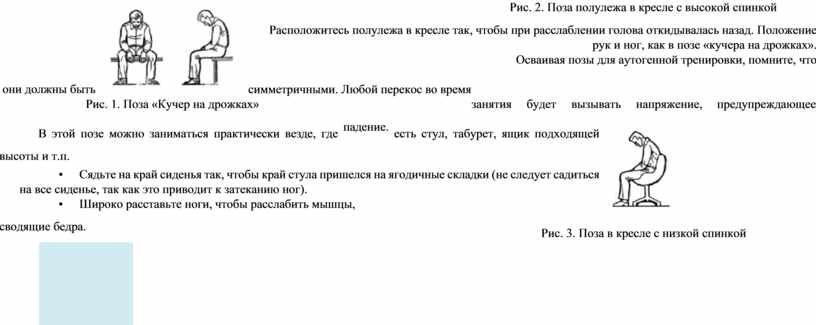 Расположитесь полулежа в кресле так, чтобы при расслаблении голова откидывалась назад. Положение рук и ног, как в позе «кучера на дрожках».