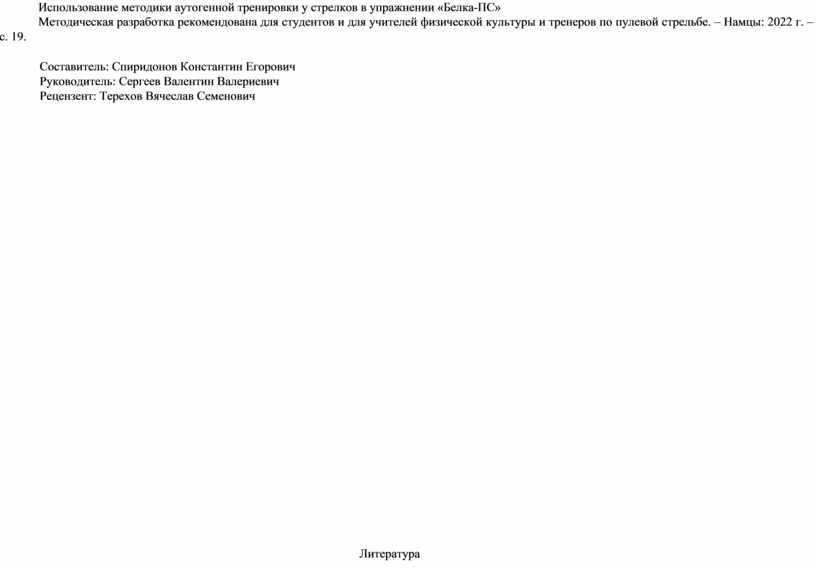 Методическая разработка рекомендована для студентов и для учителей физической культуры и тренеров по пулевой стрельбе. – Намцы: 2022 г. – с. 19.