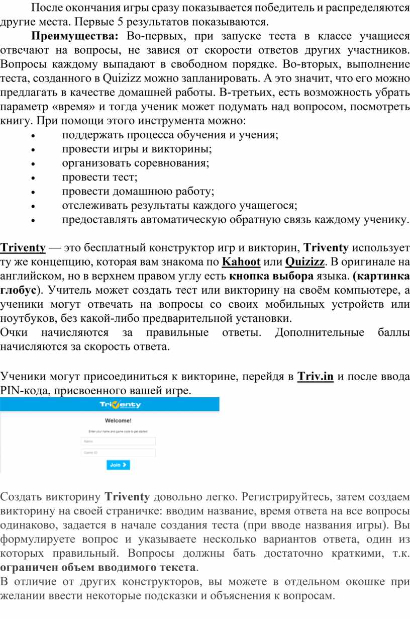 Triventy — это бесплатный конструктор игр и викторин, Triventy использует ту же концепцию, которая вам знакома по Kahoot или Quizizz. В оригинале на английском, но в верхнем правом углу есть кнопка выбора языка. (картинка глобус). Учитель может создать тест или викторину на своём компьютере, а ученики могут отвечать на вопросы со своих мобильных устройств или ноутбуков, без какой-либо предварительной установки.
