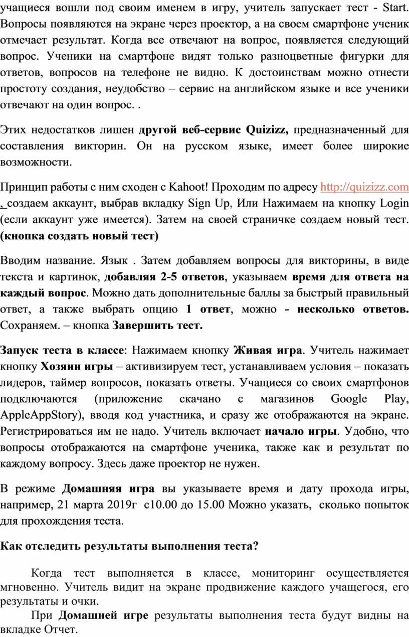 Как ученики подключаются: Учащиеся со своего компьютера или смартфона переходят по ссылке kahoot.it, вводят код игры со своего компьютера или телефона, Далее учащиеся вводят свое имя и когда все учащиеся вошли под своим именем в игру, учитель запускает тест - Start. Вопросы появляются на экране через проектор, а на своем смартфоне ученик отмечает результат. Когда все отвечают на вопрос, появляется следующий вопрос. Ученики на смартфоне видят только разноцветные фигурки для ответов, вопросов на телефоне не видно. К достоинствам можно отнести простоту создания, неудобство – сервис на английском языке и все ученики отвечают на один вопрос. .