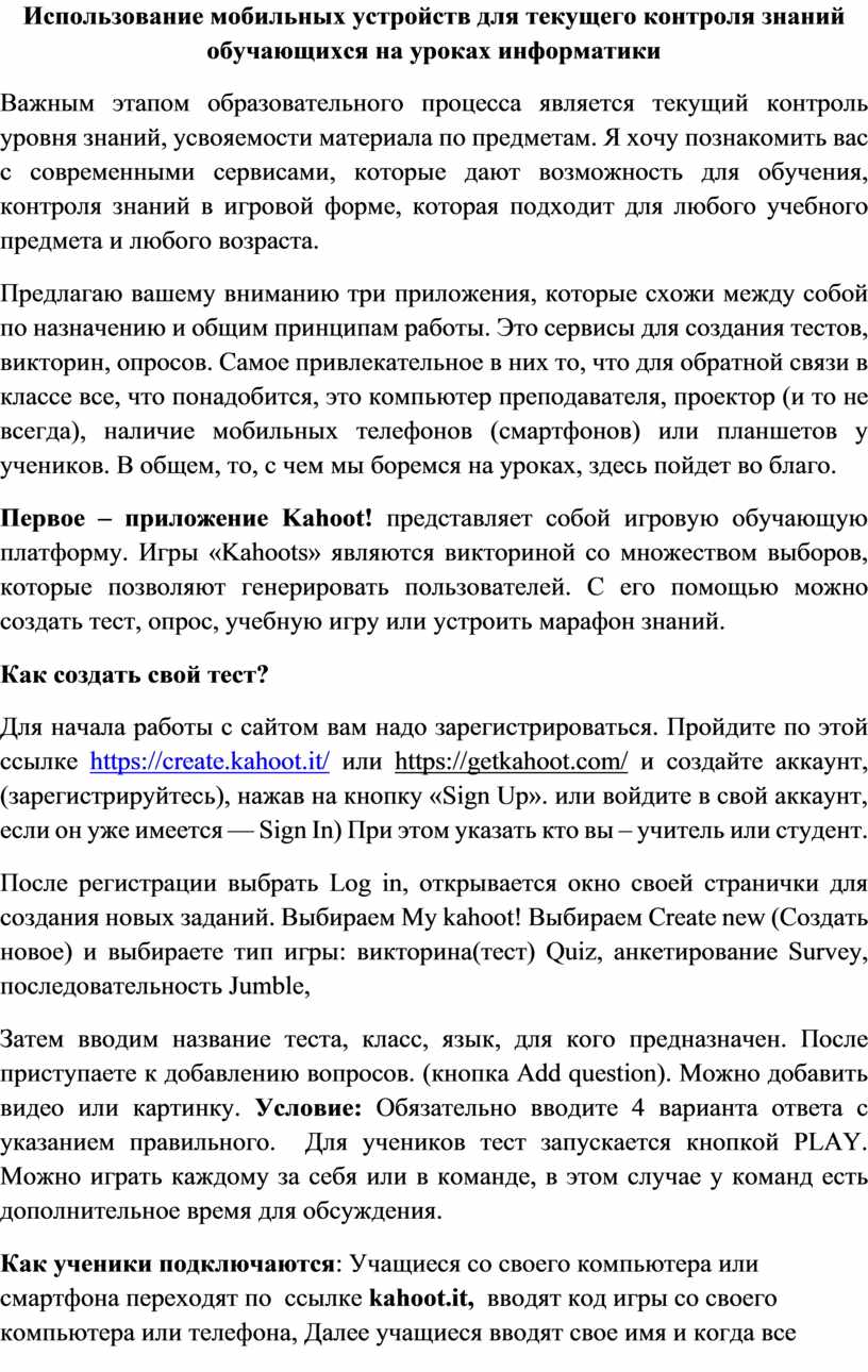 Использование мобильных устройств для текущего контроля знаний обучающихся на уроках информатики
