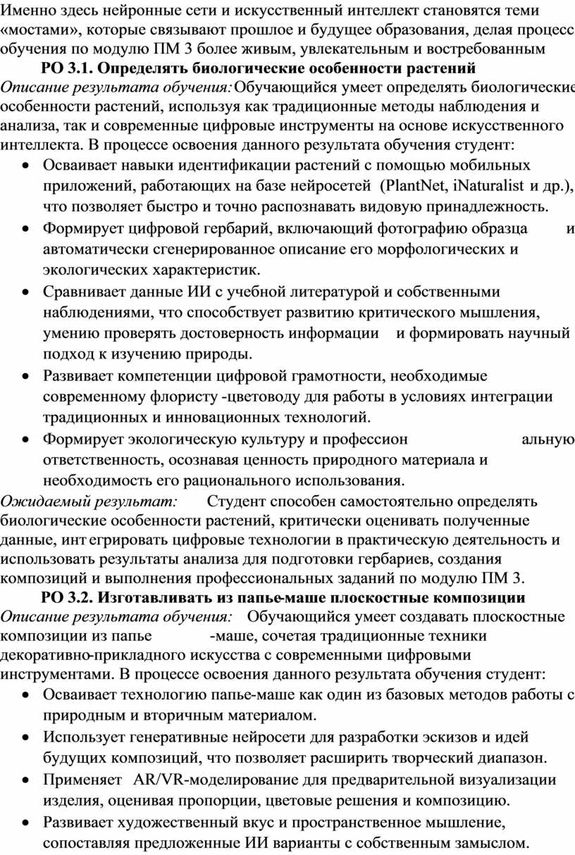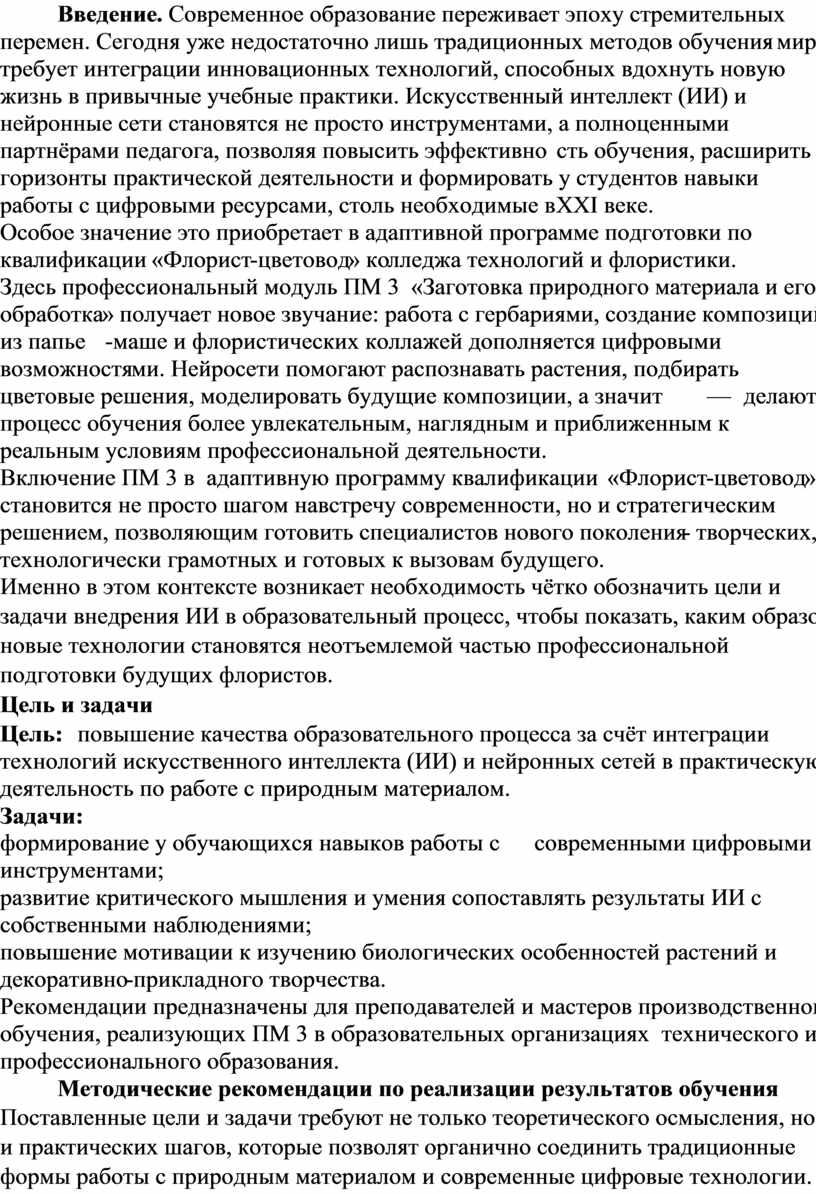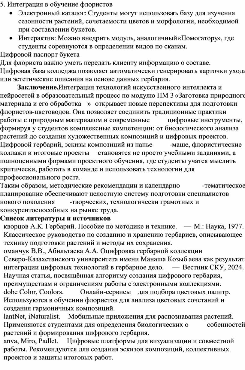 нейросетей в образовательный процесс по модулю ПМ 3 «Заготовка природного материала и его обработка» открывает новые перспективы для подготовки флористов‑цветоводов. Она позволяет соединить традиционные практики работы с природным материалом и современные цифровые инструменты, формируя у студентов комплексные компетенции: от биологического анализа растений до создания художественных композиций и цифровых проектов.