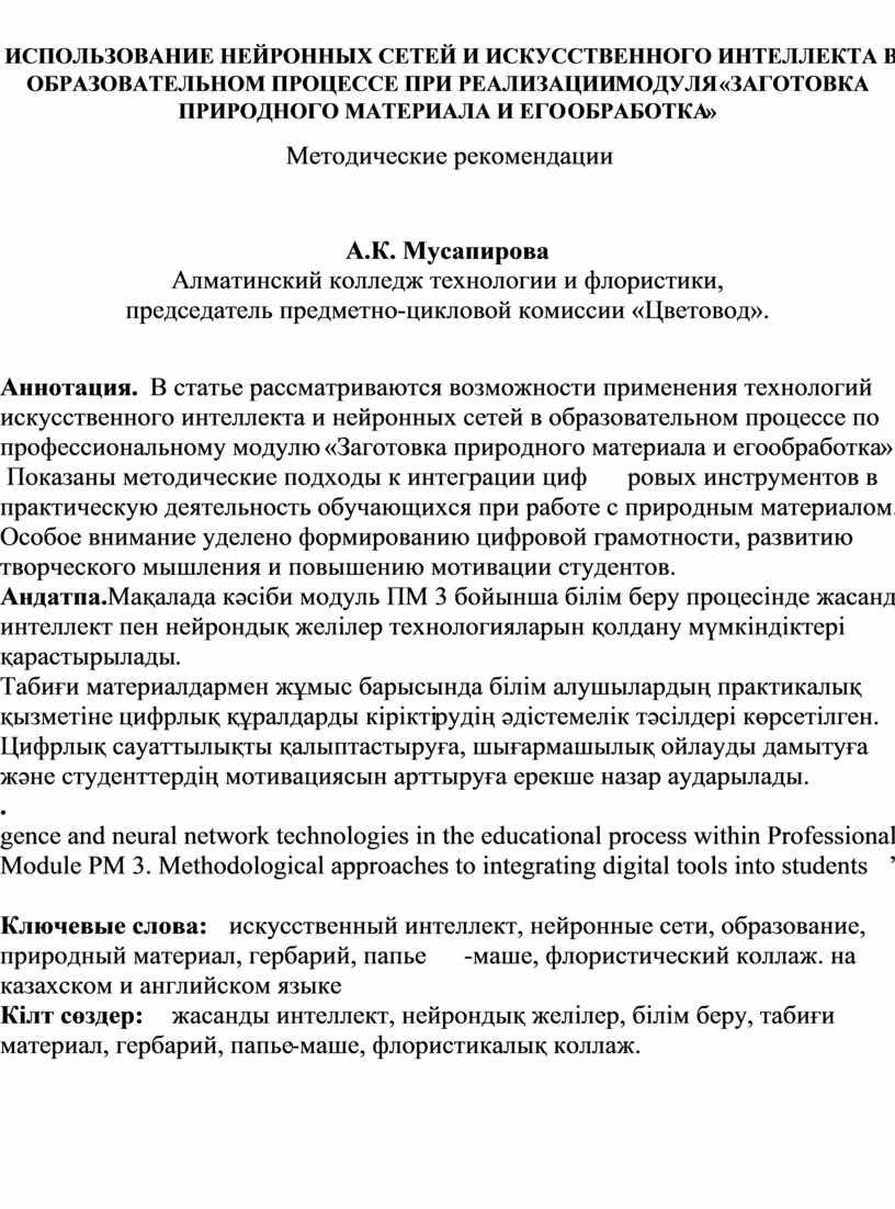 Ключевые слова: искусственный интеллект, нейронные сети, образование, природный материал, гербарий, папье-маше, флористический коллаж. на казахском и английском языке