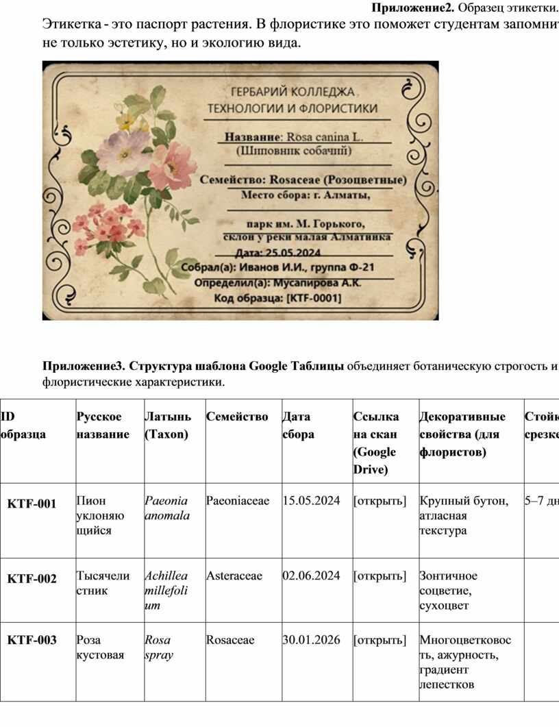 Приложение3. Структура шаблона Google Таблицы объединяет ботаническую строгость и флористические характеристики.