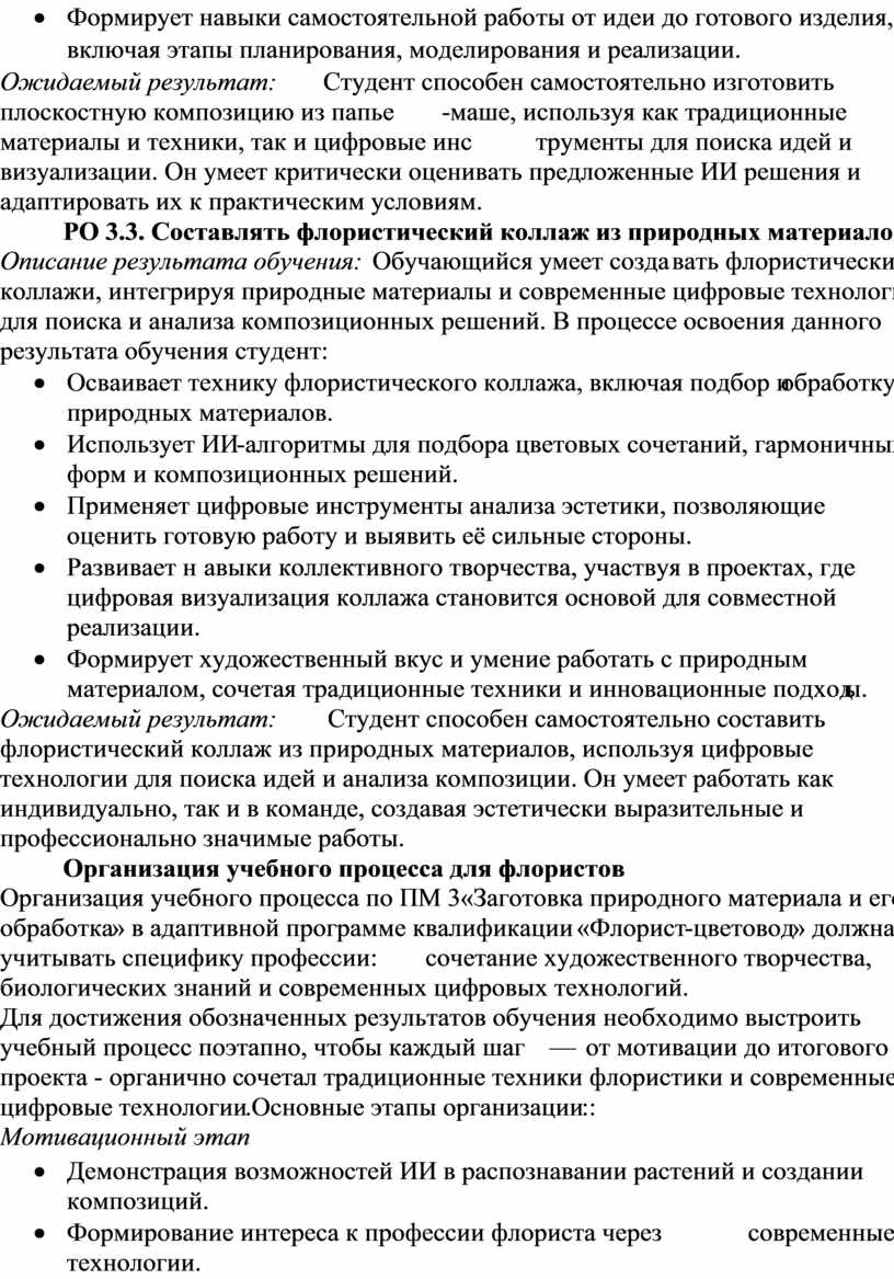 Организация учебного процесса по ПМ 3 «Заготовка природного материала и его обработка» в адаптивной программе квалификации «Флорист‑цветовод» должна учитывать специфику профессии: сочетание художественного творчества, биологических знаний и современных цифровых технологий.