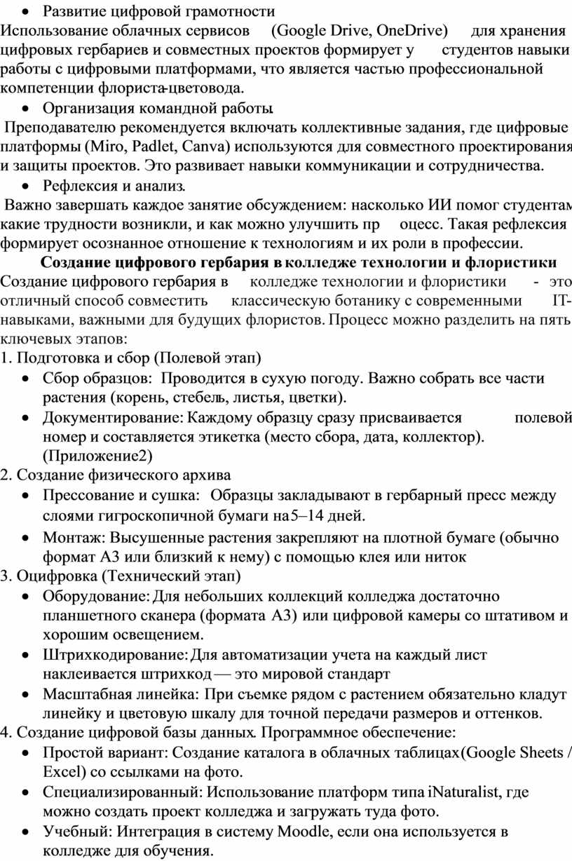 Использование облачных сервисов (Google Drive, OneDrive) для хранения цифровых гербариев и совместных проектов формирует у студентов навыки работы с цифровыми платформами, что является частью профессиональной компетенции флориста‑цветовода.