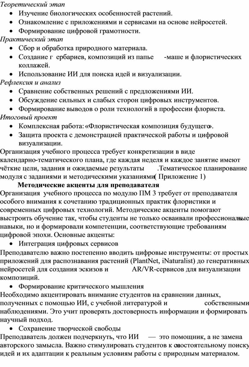 Организация учебного процесса по модулю ПМ 3 требует от преподавателя особого внимания к сочетанию традиционных практик флористики и современных цифровых технологий. Методические акценты помогают выстроить обучение так, чтобы студенты не только осваивали профессиональные навыки, но и формировали компетенции, соответствующие требованиям цифровой эпохи. Основные акценты: