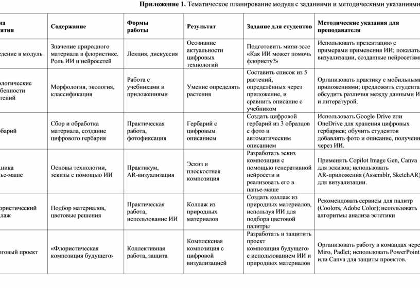 Приложение 1. Тематическое планирование модуля с заданиями и методическими указаниями