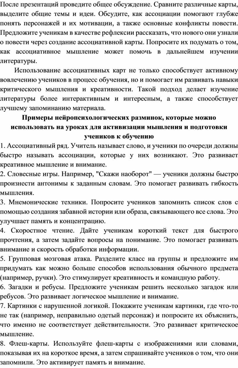После презентаций проведите общее обсуждение. Сравните различные карты, выделите общие темы и идеи. Обсудите, как ассоциации помогают глубже понять персонажей и их мотивации, а также основные конфликты повести. Предложите ученикам в качестве рефлексии рассказать, что нового они узнали о повести через создание ассоциативной карты. Попросите их подумать о том, как ассоциативное мышление может помочь в дальнейшем изучении литературы.