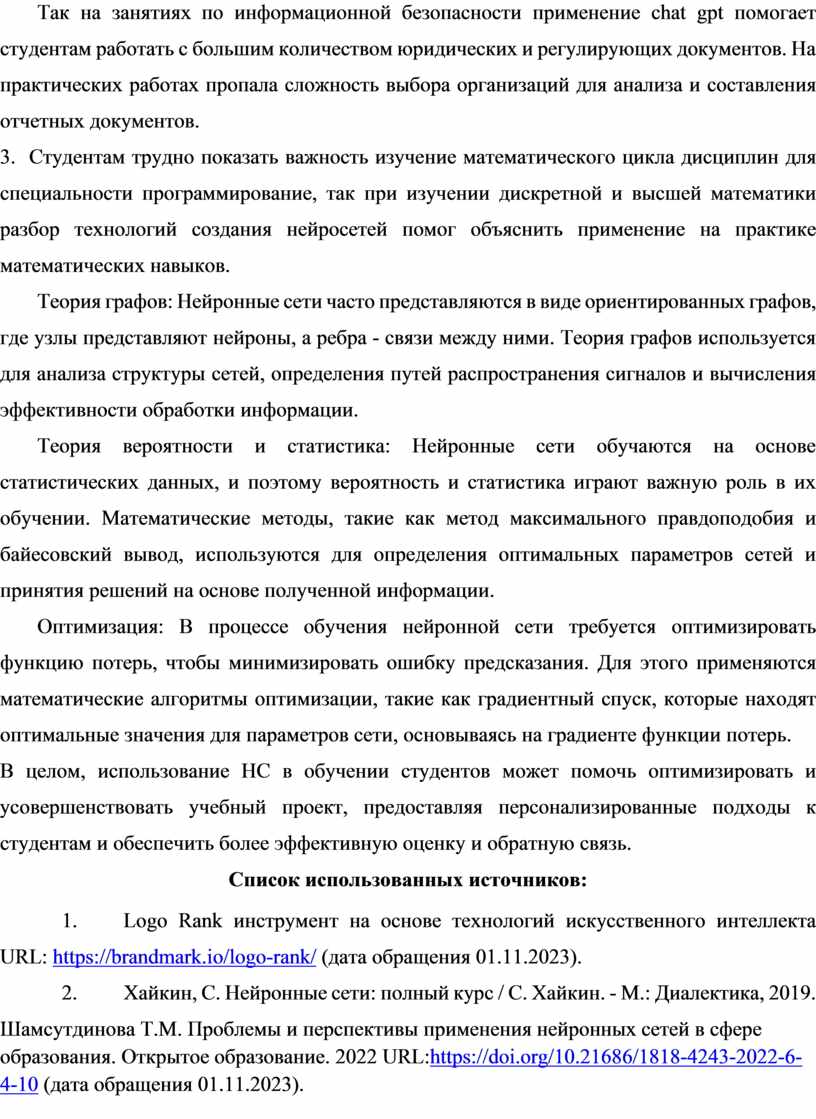 3. Шамсутдинова Т.М. Проблемы и перспективы применения нейронных сетей в сфере образования. Открытое образование. 2022 URL:https://doi.org/10.21686/1818-4243-2022-6-4-10 (дата обращения 01.11.2023).