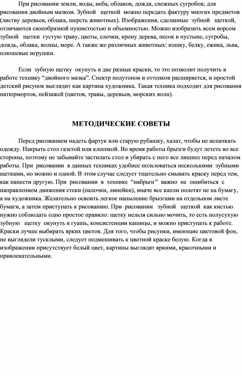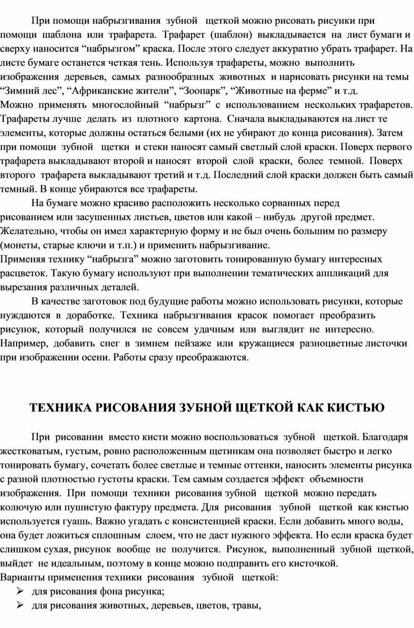 Ø выделить и дать описание возможным видам рисования зубной щеткой;