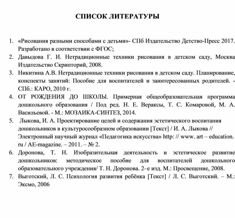 6. Доронова, Т. Н. Изобразительная деятельность и эстетическое развитие дошкольников: методическое пособие для воспитателей дошкольного образовательного учреждения/ Т. Н. Доронова. 2–е изд. М.: Просвещение, 2008.