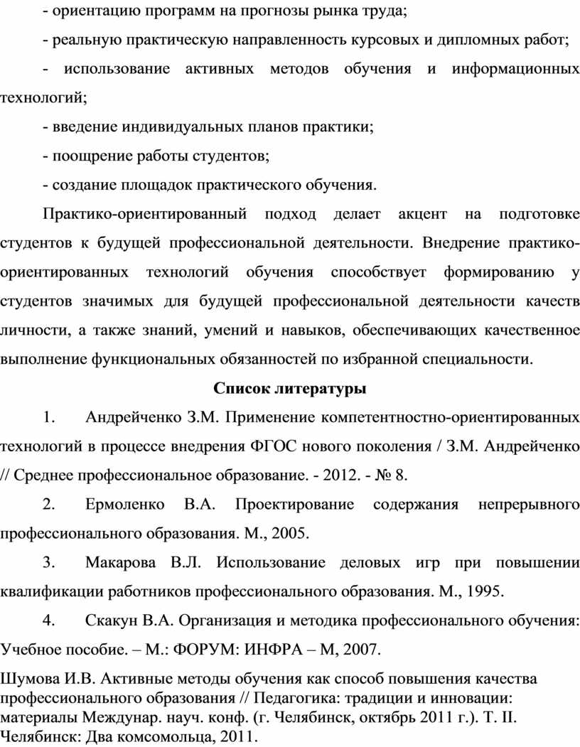 5. Шумова И.В. Активные методы обучения как способ повышения качества профессионального образования // Педагогика: традиции и инновации: материалы Междунар. науч. конф. (г. Челябинск, октябрь 2011 г.). Т. II. Челябинск: Два комсомольца, 2011.