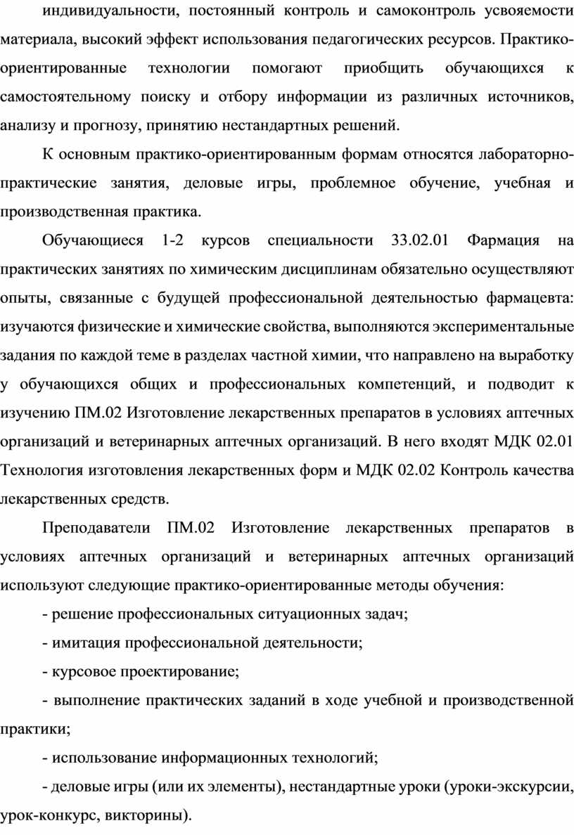 ИСПОЛЬЗОВАНИЕ ПРАКТИКО-ОРИЕНТИРОВАННОЙ ТЕХНОЛОГИИ ОБУЧЕНИЯ НА ЗАНЯТИЯХ ПМ.02 ИЗГОТОВЛЕНИЕ ЛЕКАРСТВЕННЫХ ПРЕПАРАТОВ В УСЛОВИЯХ АПТЕЧНЫХ ОРГАНИЗАЦИЙ И ВЕТЕРИНАРНЫХ АПТЕЧНЫХ ОРГАНИЗАЦИЙ