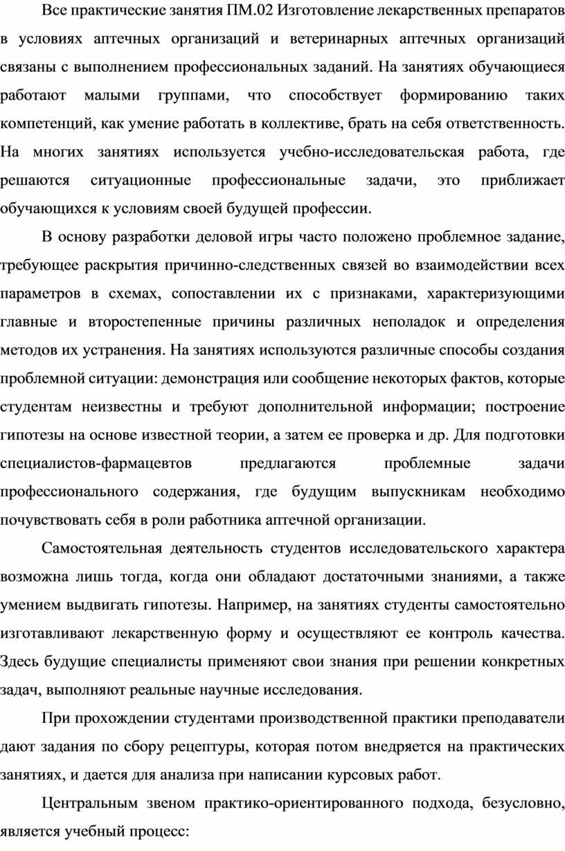 Все практические занятия ПМ.02 Изготовление лекарственных препаратов в условиях аптечных организаций и ветеринарных аптечных организаций связаны с выполнением профессиональных заданий. На занятиях обучающиеся работают малыми группами, что способствует формированию таких компетенций, как умение работать в коллективе, брать на себя ответственность. На многих занятиях используется учебно-исследовательская работа, где решаются ситуационные профессиональные задачи, это приближает обучающихся к условиям своей будущей профессии.