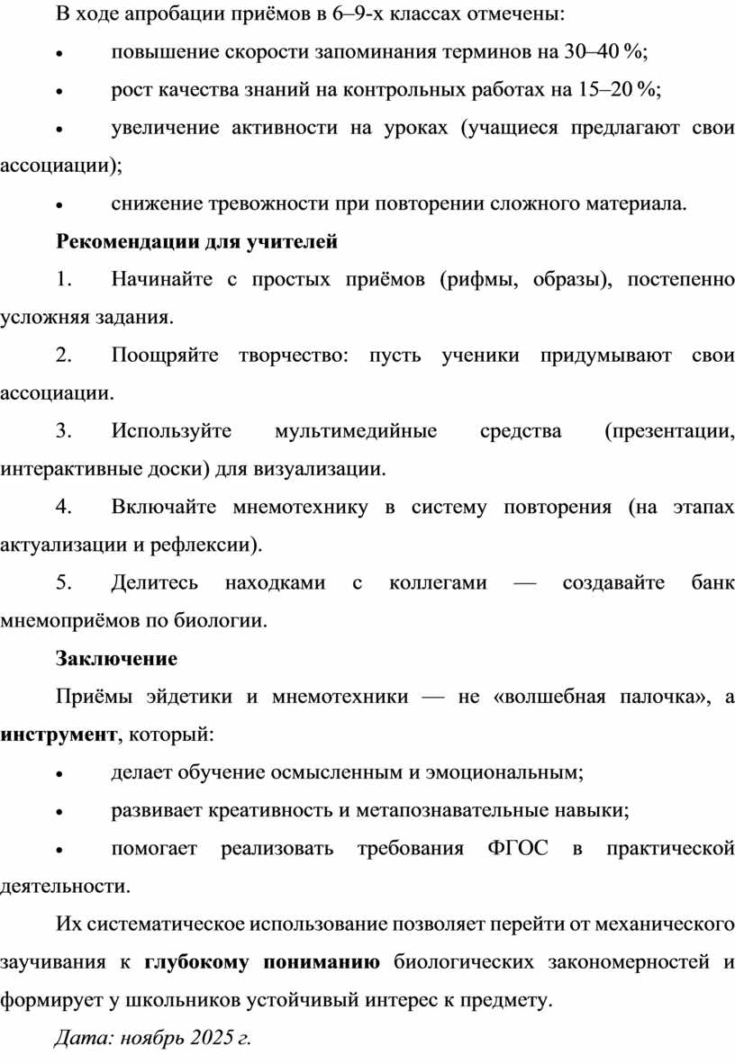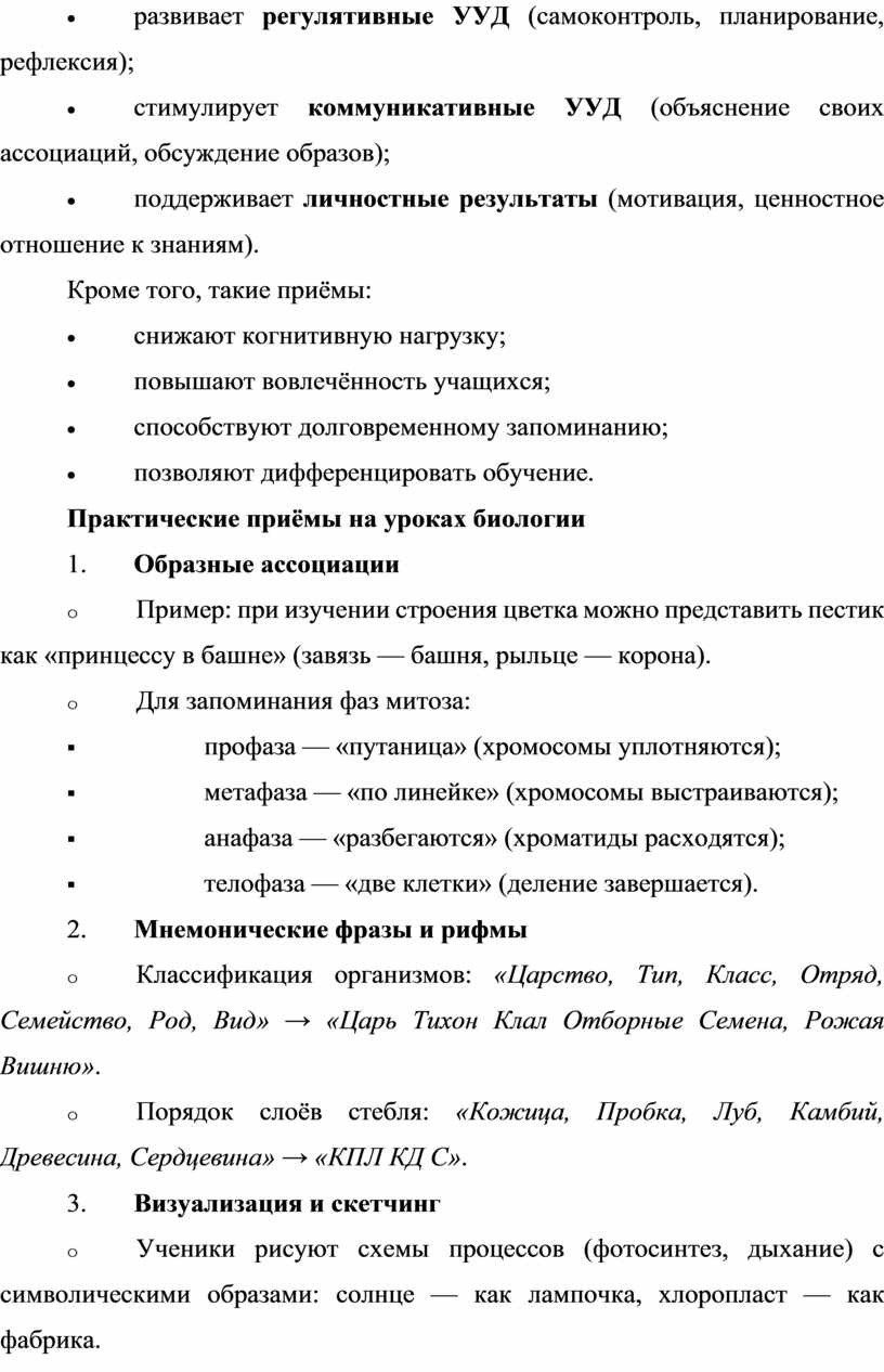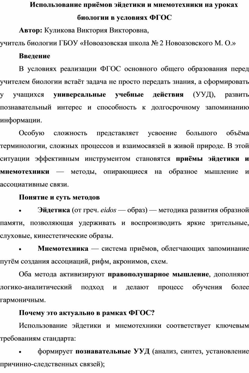 Использование приёмов эйдетики и мнемотехники на уроках биологии в условиях ФГОС