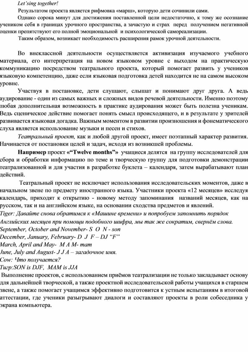 Театральный проект не исключает использования исследовательских моментов, даже в начальном звене по предмету иностранного языка. Участники проекта «12 месяцев» исследуя календарь, приходят к открытию - новому методу запоминания названий месяцев, как на русском, так и на английском языке, на основании сходства предметов и явлений.