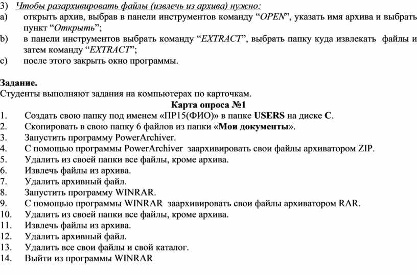 Оборудование: персональный компьютер, программы архиваторы, методические указания по работе (в электронном виде находятся в папке «Методические указания» на рабочем столе компьютера), карты-задания