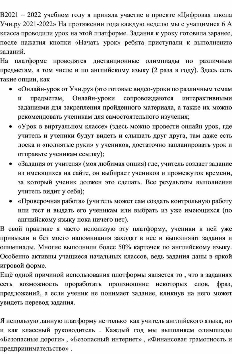 Я использую данную платформу не только как учитель английского языка, но и как классный руководитель . Каждый год мы выполняем олимпиады «Безопасные дороги» , «Безопасный интернет» , «Финансовая грамотность и предпринимательство» .