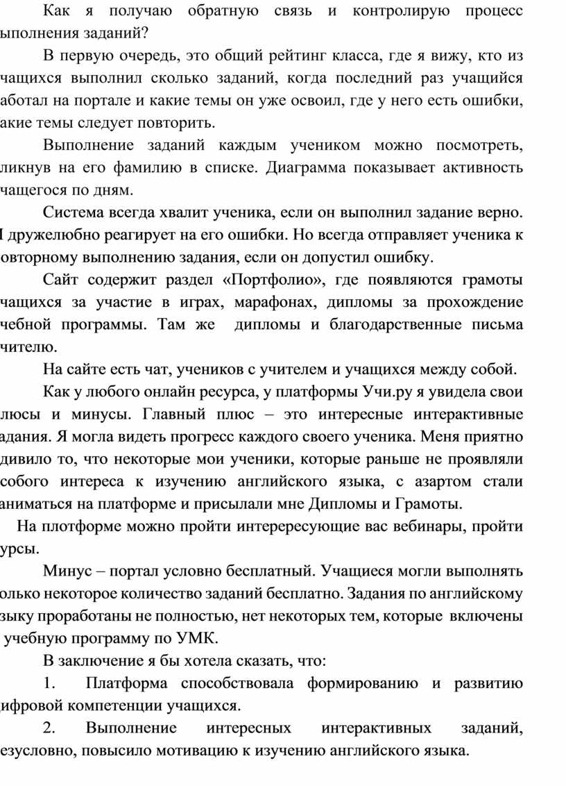 Как у любого онлайн ресурса, у платформы Учи.ру я увидела свои плюсы и минусы. Главный плюс – это интересные интерактивные задания. Я могла видеть прогресс каждого своего ученика. Меня приятно удивило то, что некоторые мои ученики, которые раньше не проявляли особого интереса к изучению английского языка, с азартом стали заниматься на платформе и присылали мне Дипломы и Грамоты.