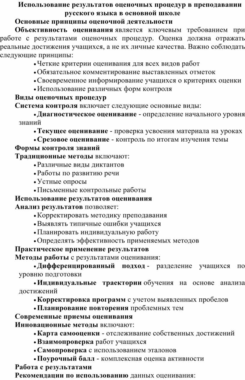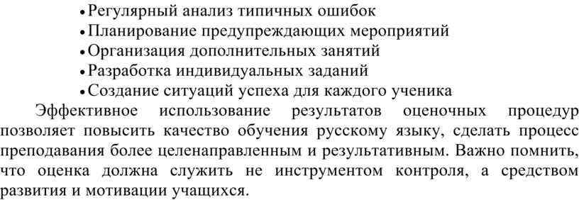 Эффективное использование результатов оценочных процедур позволяет повысить качество обучения русскому языку, сделать процесс преподавания более целенаправленным и результативным. Важно помнить, что оценка должна служить не инструментом контроля, а средством развития и мотивации учащихся.