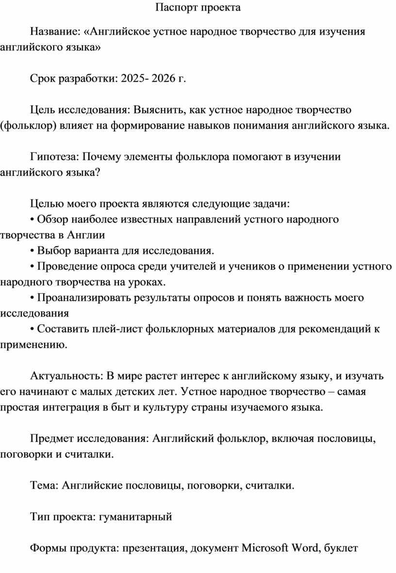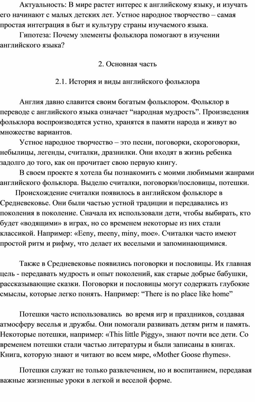 Актуальность: В мире растет интерес к английскому языку, и изучать его начинают с малых детских лет. Устное народное творчество – самая простая интеграция в быт и культуру страны изучаемого языка.