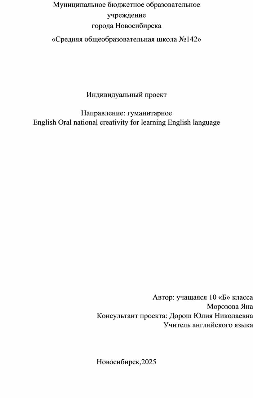 Выбор моего проекта – тема «Использование устного народного творчества для изучения английского языка». Я выбрала эту тему проекта, так как меня интересуют вопросы общения между людьми из разных стран. Английский язык - главный язык глобального общения, который также позволяет путешествовать без языкового барьера.