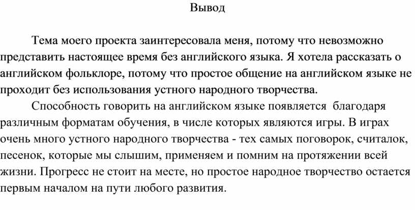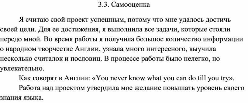 Я считаю свой проект успешным, потому что мне удалось достичь своей цели. Для ее достижения, я выполнила все задачи, которые стояли передо мной. Во время работы я получила большое количество информации о народном творчестве Англии, узнала много интересного, выучила несколько считалок и пословиц. В процессе работы было нелегко, но увлекательно.