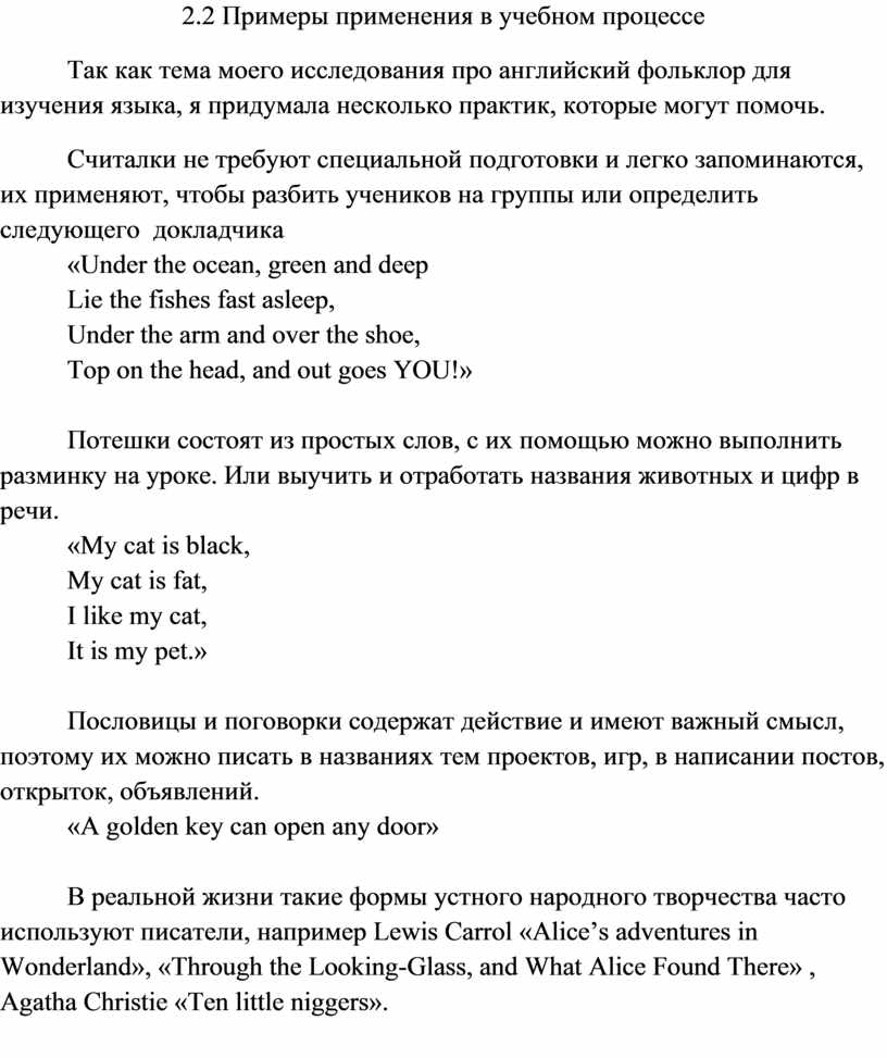 В реальной жизни такие формы устного народного творчества часто используют писатели, например Lewis Carrol «Alice’s adventures in Wonderland», «Through the Looking-Glass, and What Alice Found There» , Agatha Christie «Ten little niggers».
