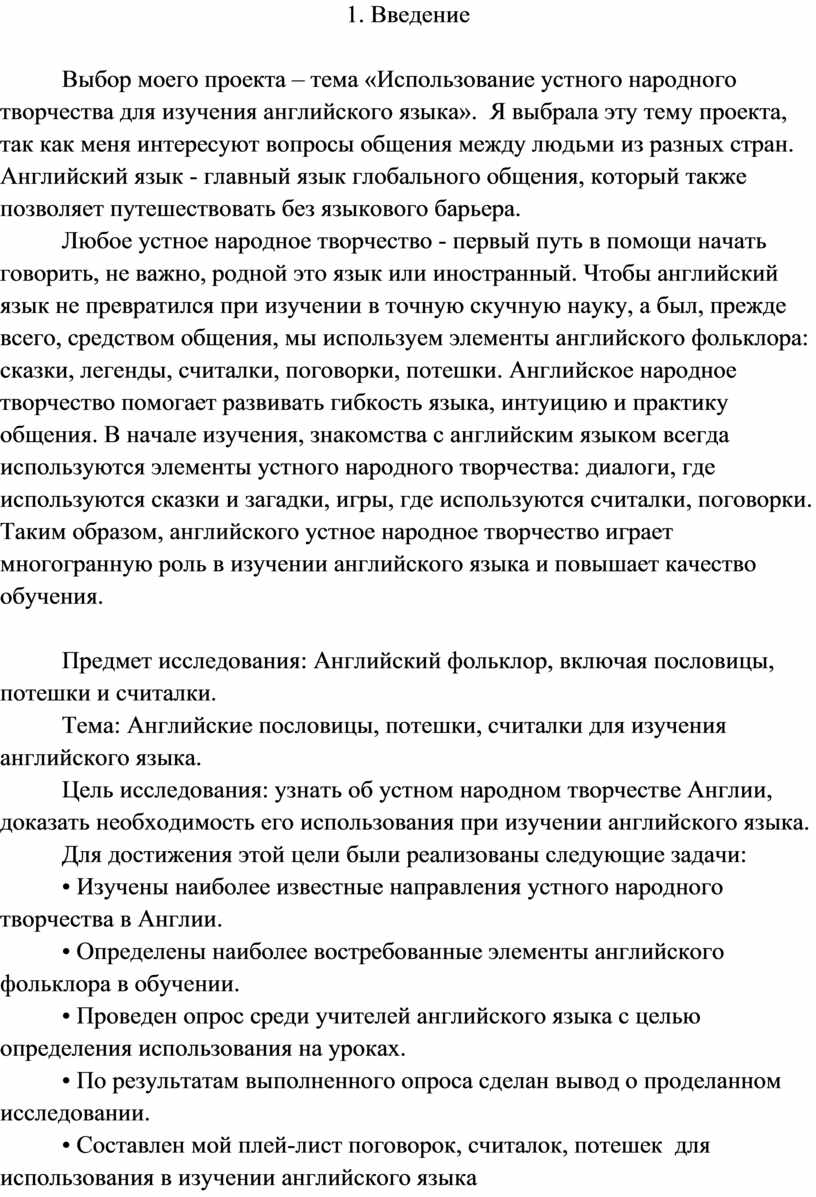 Любое устное народное творчество - первый путь в помощи начать говорить, не важно, родной это язык или иностранный. Чтобы английский язык не превратился при изучении в точную скучную науку, а был, прежде всего, средством общения, мы используем элементы английского фольклора: сказки, легенды, считалки, поговорки, потешки. Английское народное творчество помогает развивать гибкость языка, интуицию и практику общения. В начале изучения, знакомства с английским языком всегда используются элементы устного народного творчества: диалоги, где используются сказки и загадки, игры, где используются считалки, поговорки. Таким образом, английского устное народное творчество играет многогранную роль в изучении английского языка и повышает качество обучения.