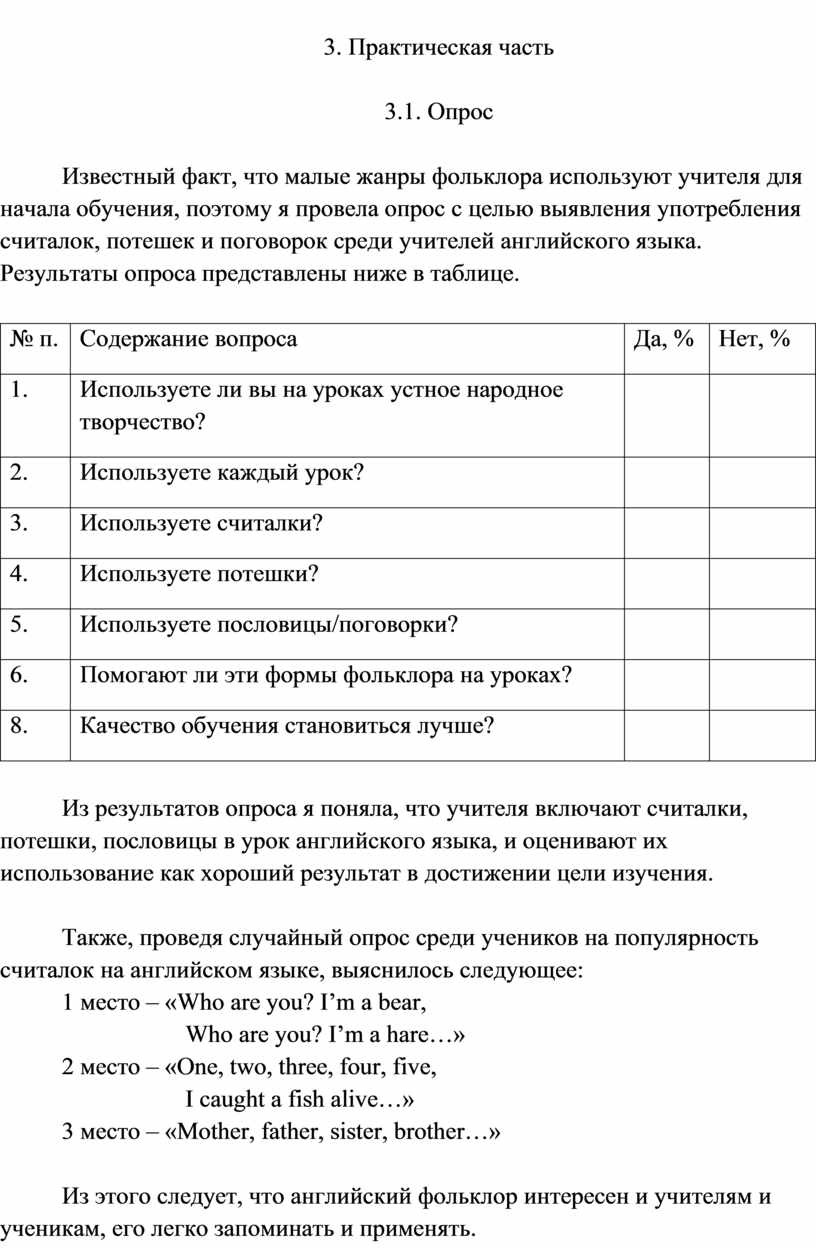 Известный факт, что малые жанры фольклора используют учителя для начала обучения, поэтому я провела опрос с целью выявления употребления считалок, потешек и поговорок среди учителей английского языка. Результаты опроса представлены ниже в таблице.