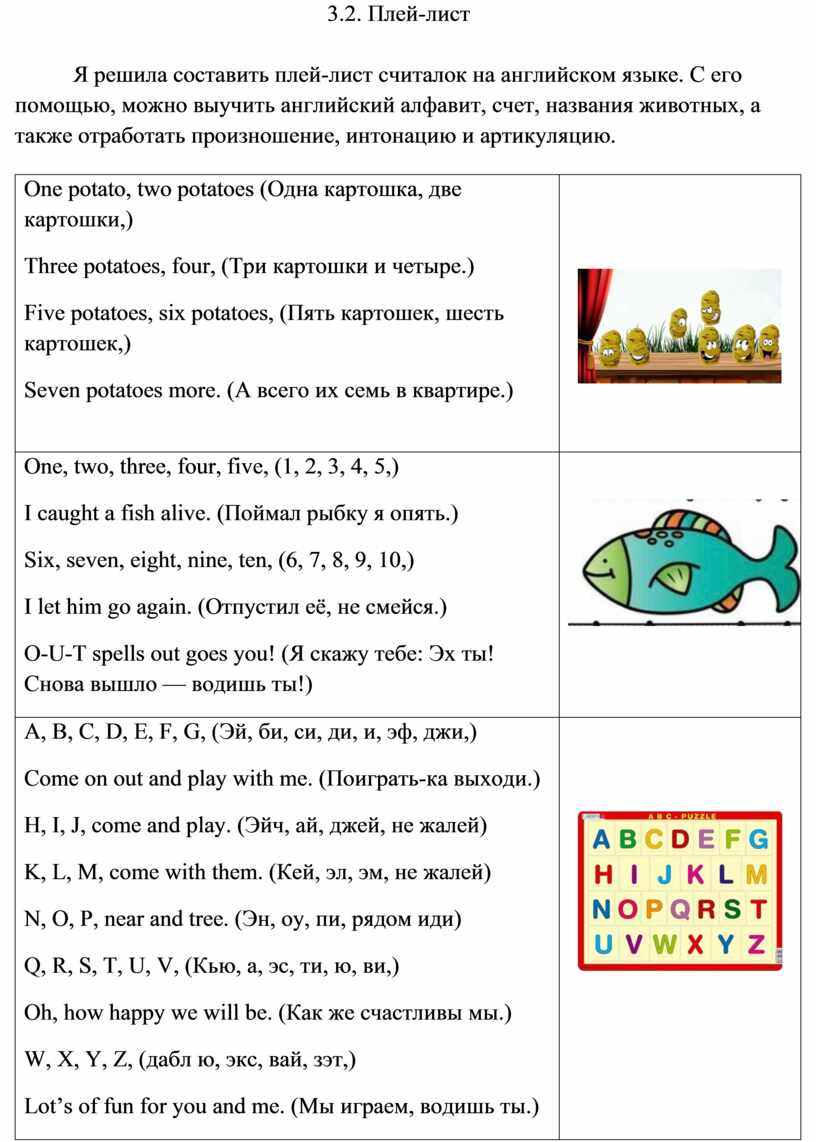 Я решила составить плей-лист считалок на английском языке. С его помощью, можно выучить английский алфавит, счет, названия животных, а также отработать произношение, интонацию и артикуляцию.