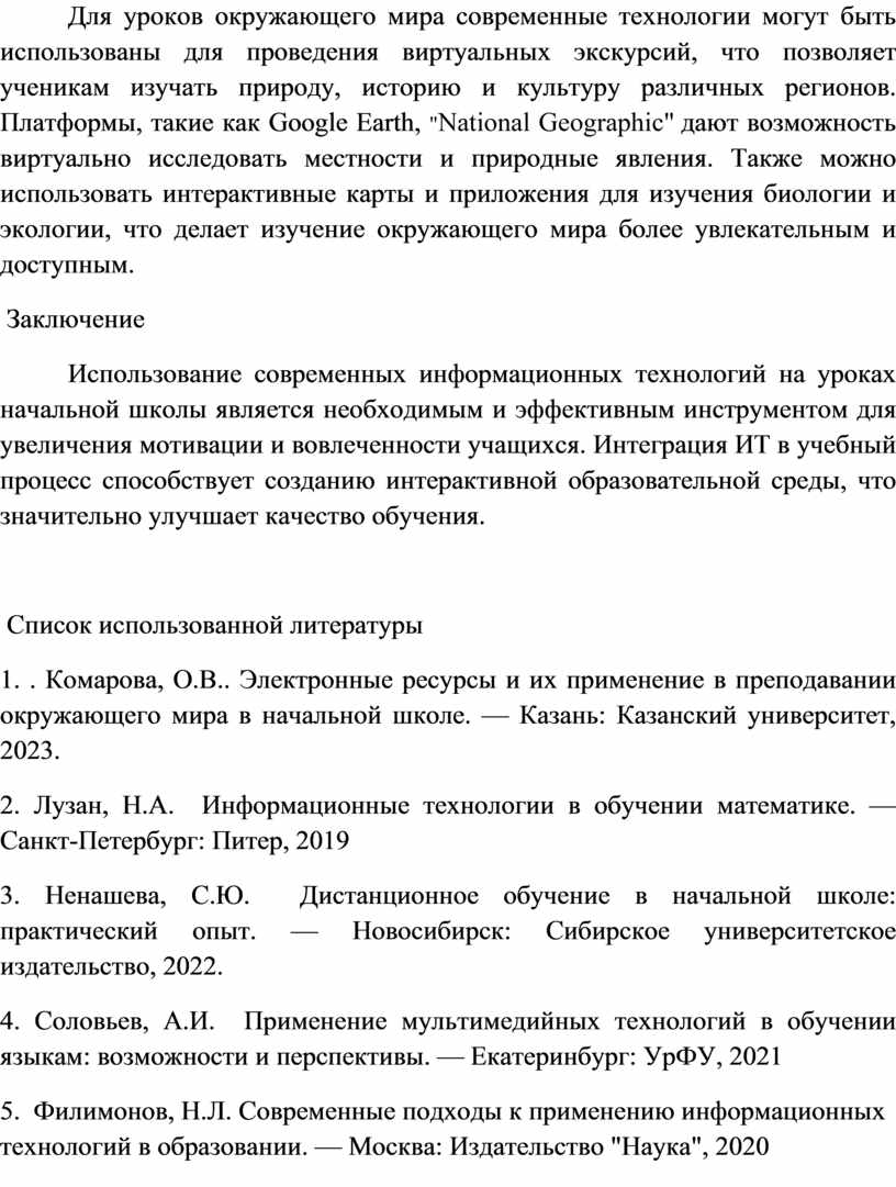1. . Комарова, О.В.. Электронные ресурсы и их применение в преподавании окружающего мира в начальной школе. — Казань: Казанский университет, 2023.