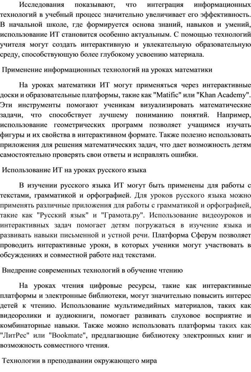 Исследования показывают, что интеграция информационных технологий в учебный процесс значительно увеличивает его эффективность. В начальной школе, где формируется основа знаний, навыков и умений, использование ИТ становится особенно актуальным. С помощью технологий учителя могут создать интерактивную и увлекательную образовательную среду, способствующую более глубокому усвоению материала.