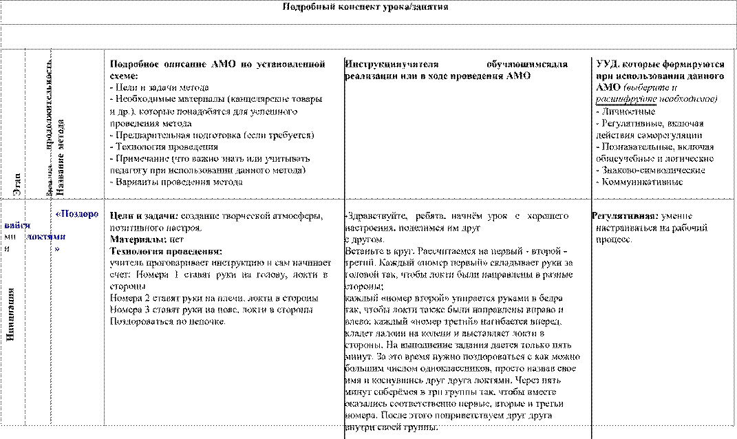 Методы («Мой цветок», «Галерея портретов», «Поздоровайся локтями», «Измерим друг друга» или «Летающие имена») эффективно и динамично помогут начать урок, задать нужный ритм, обеспечить рабочий настрой и хорошую атмосферу в классе, помогают переключиться с одного учебного предмета на другой.