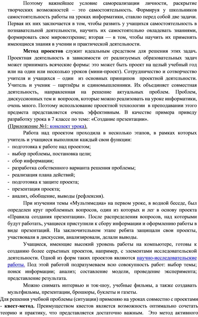 Метод проектов служит идеальным средством для решения этих задач. Проектная деятельность в зависимости от реализуемых образовательных задач может принимать всяческие формы: это может быть проект на целый учебный год или на один или несколько уроков (мини-проект). Сотрудничество и сотворчество учителя и учащихся – один из основных принципов проектной деятельности. Учитель и ученик – партнёры и единомышленники. Их объединяет совместная деятельность, направленная на решение актуальных проблем. Проблем, дискуссионных тем и вопросов, которые можно реализовать на уроке информатики, очень много. Поэтому использование проектной технологии в преподавании этого предмета представляется очень эффективным. В качестве примера приведу разработку урока в 7 классе по теме: «Создание презентации».
