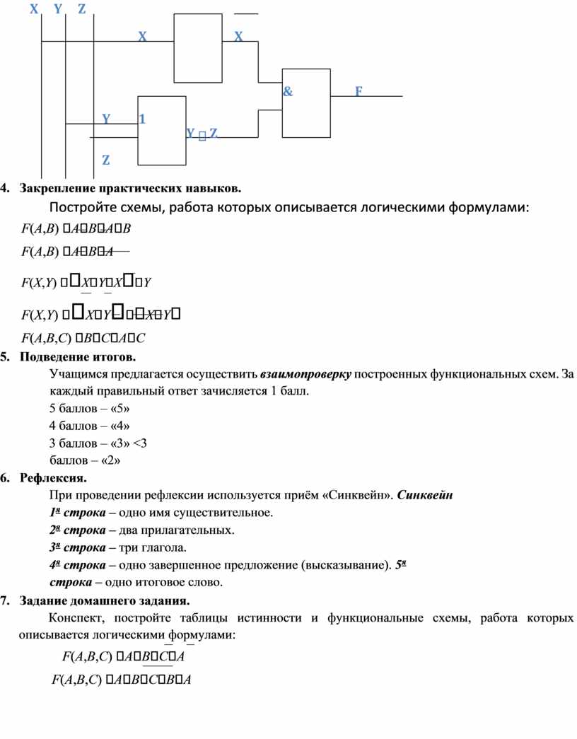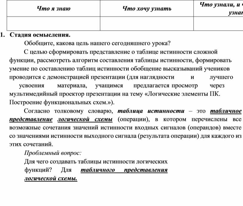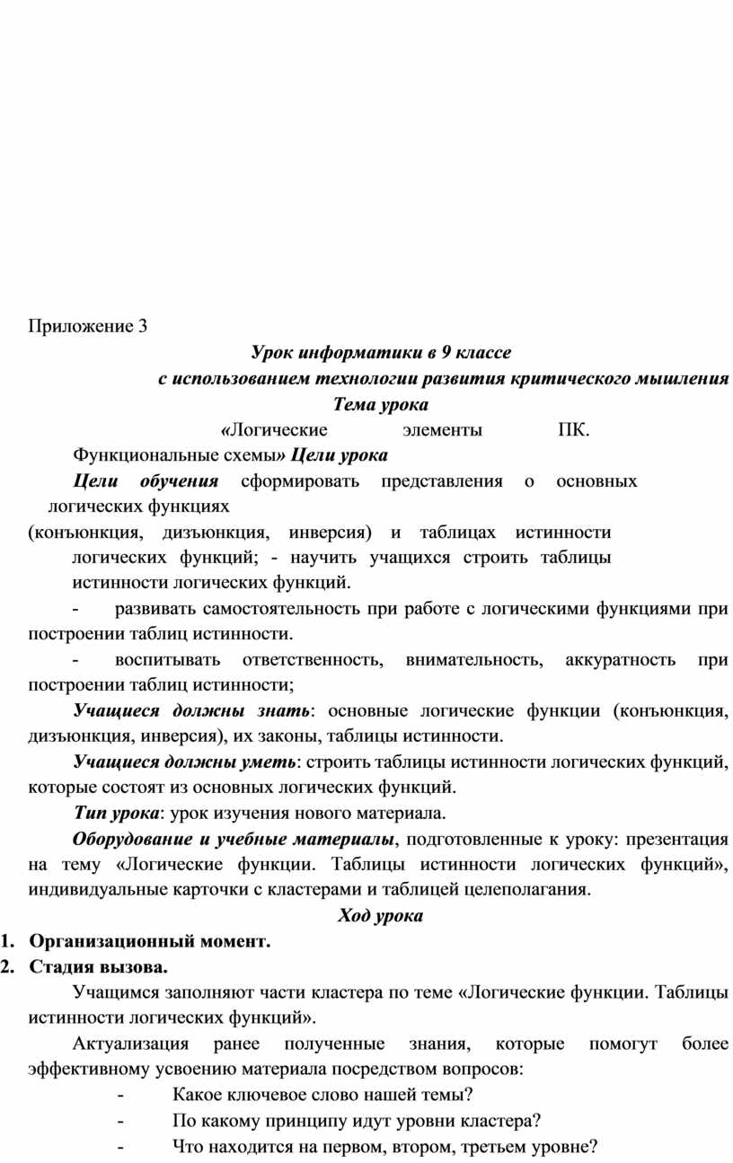 В 9 классе при рассмотрении темы «Логические элементы ПК. Функциональные схемы» реализую данную технологию через три этапа: вызова, осмысления и рефлексии. (Приложение №3. конспект урока).