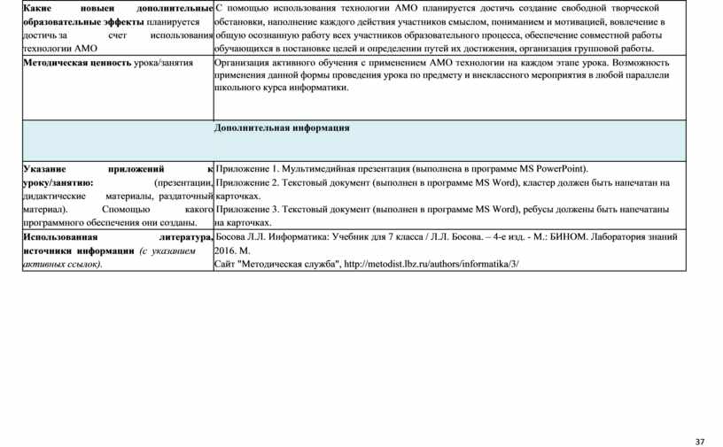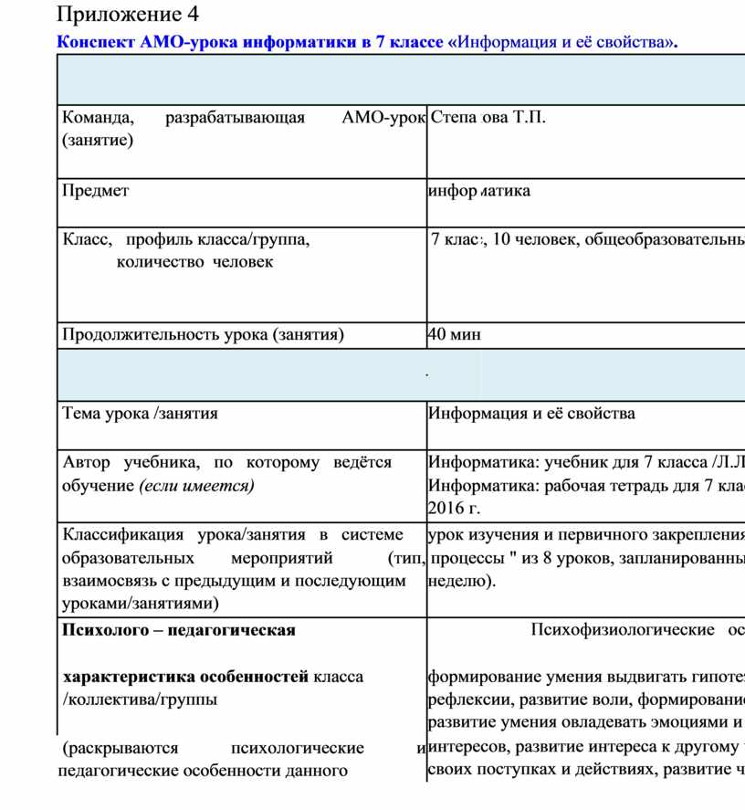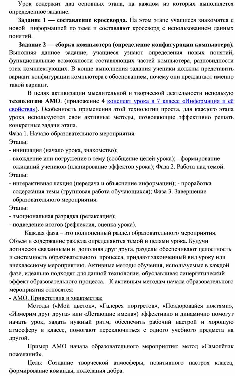 В целях активизации мыслительной и творческой деятельности использую технологию АМО. (приложение 4 конспект урока в 7 классе «Информация и её свойства»). Особенность применения этой технологии проста, для каждого этапа урока используются свои активные методы, позволяющие эффективно решать конкретные задачи этапа.