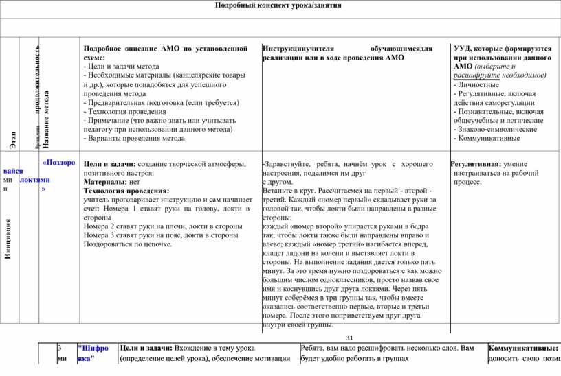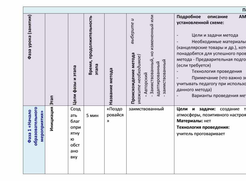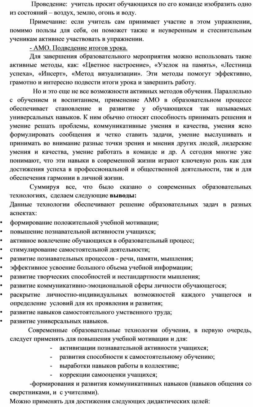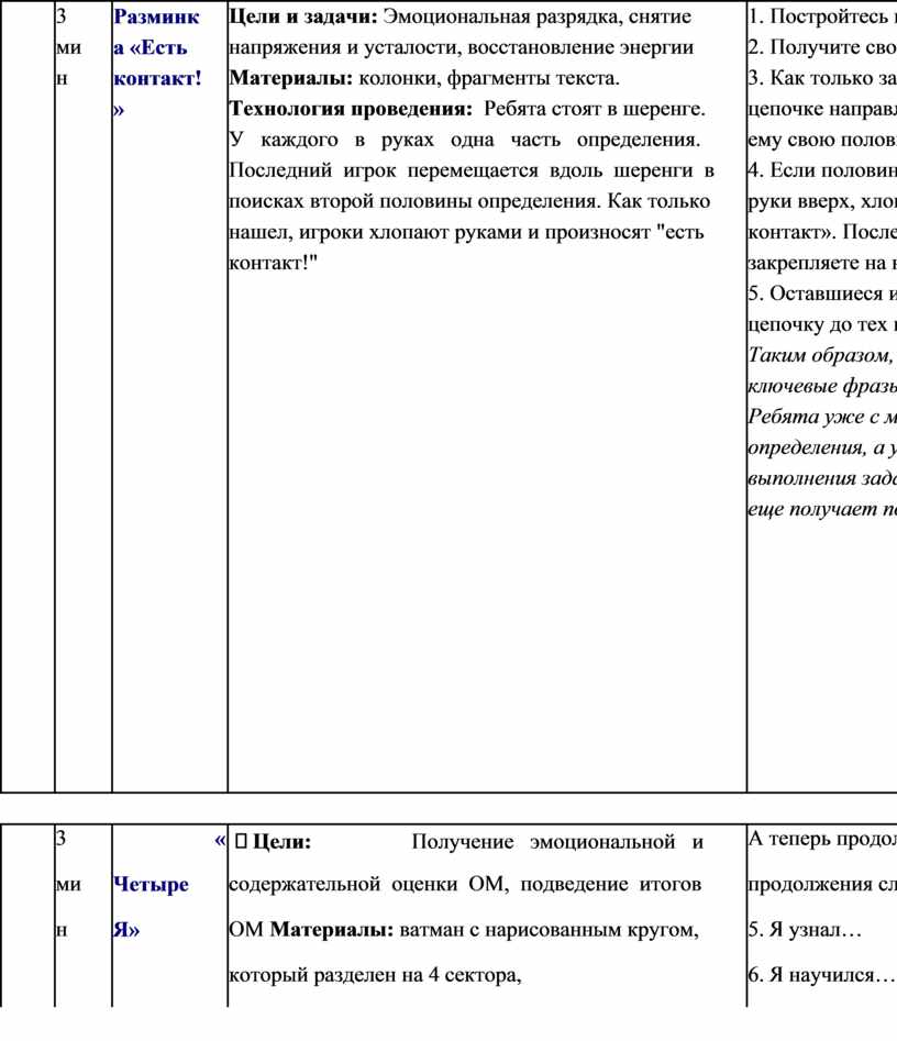 Каждая фаза – это полноценный раздел образовательного мероприятия. Объем и содержание раздела определяются темой и целями урока. Будучи логически связанными и дополняя друг друга, разделы обеспечивают целостность и системность образовательного процесса, придают законченный вид уроку или внеклассному мероприятию. Активные методы обучения, используемые в каждой фазе, идеально подходят для данной технологии, обуславливая синергетический эффект образовательного процесса. К активным методам начала образовательного мероприятия относятся: