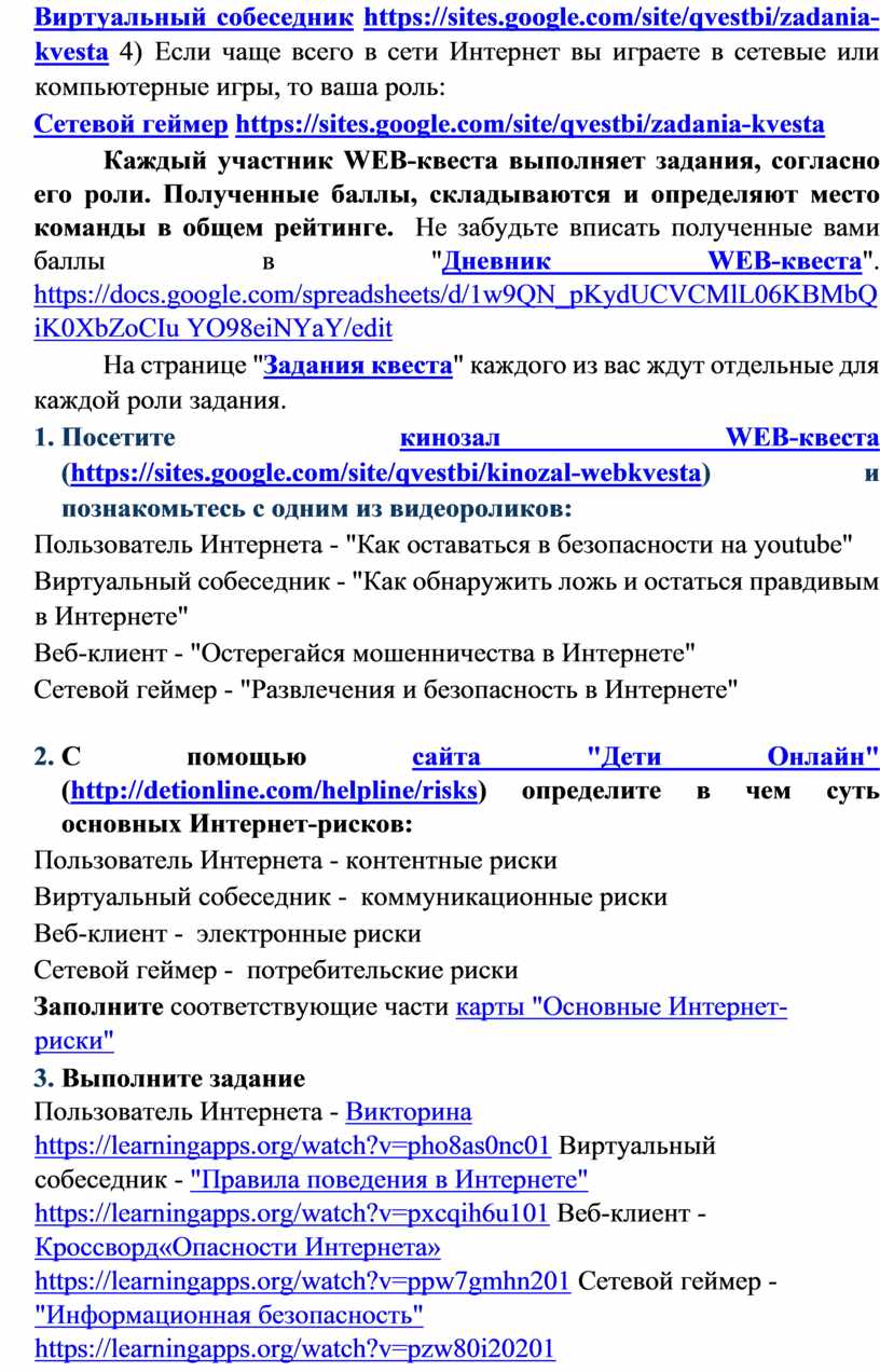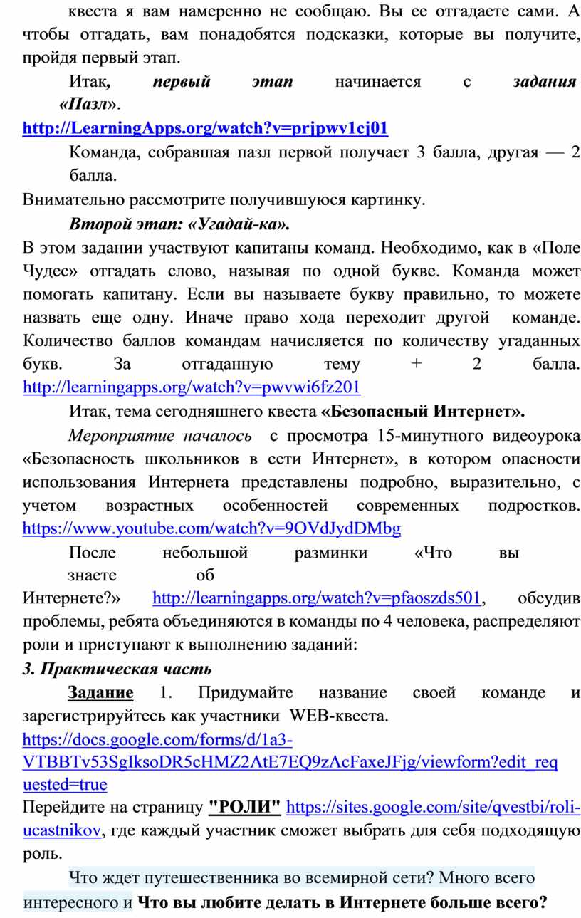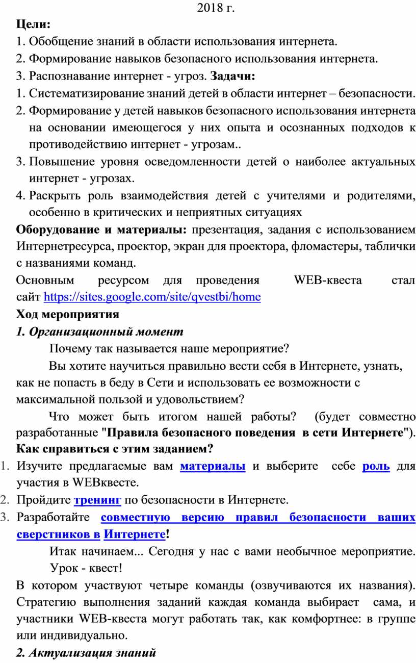 Для решения учебной проблемы (ситуации) применяю на уроках совместно с проектами - квест-метод. Преимуществом квестов является возможность оптимально сочетать теорию и практику, что представляется достаточно важным. Это метод активного обучения основан на реальных ситуациях. Вот один из примеров: внеклассное мероприятие по информатике в 7-8 классах по теме «Интернет без опасности». (Приложение № 2. Разработка мероприятия). Учащиеся на уроке сталкиваются с ситуацией оказания помощи в создании правил безопасного пользования интернетом, в качестве рабочей площадки используют ресурс https://sites.google.com/site/qvestbi/home. На уроке ребенку предоставляется возможность в большей степени посвятить себя творчеству, тем самым закрепляются знания, формируются умения и навыки безопасной работы в интернете.