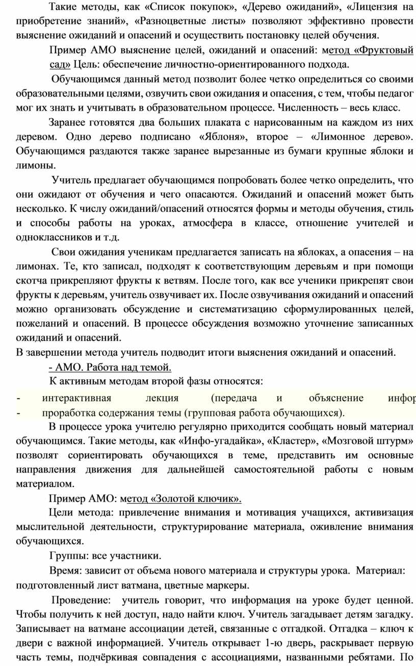 Такие методы, как «Список покупок», «Дерево ожиданий», «Лицензия на приобретение знаний», «Разноцветные листы» позволяют эффективно провести выяснение ожиданий и опасений и осуществить постановку целей обучения.